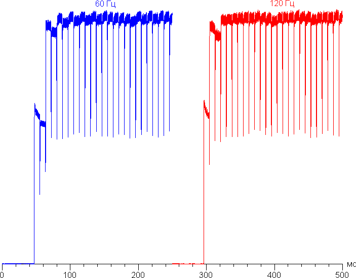 По факту частота обновления повышается максимум до 120 Гц. При этом режим всегда динамичный, и если не касаться экрана, то частота обновления почти сразу снижается до 30 Гц и даже до 1 Гц (по данным мониторинга). Данной настройкой пользователь ограничивает только максимальную частоту обновления. В режиме 120 Гц плавность прокрутки списков меню заметно повышается. Характер модуляции при этом не меняется.