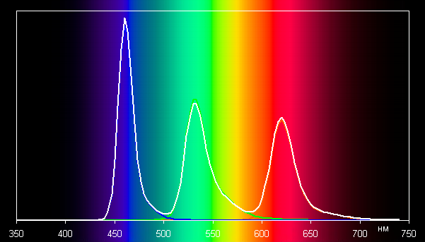 В первом случае спектры компонент (то есть спектры чистых красного, зеленого и синего цветов) очень хорошо разделены: