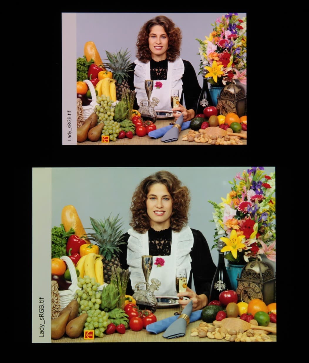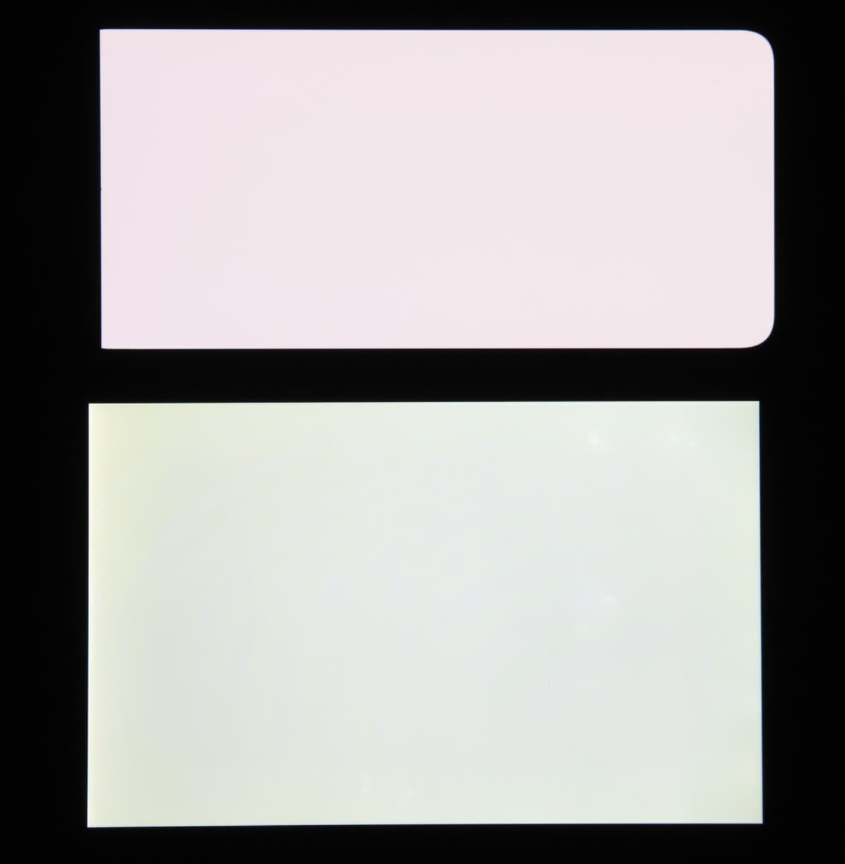 Согласно визуальной оценке, цвета у тестируемого экрана более-менее естественные, а цветовой баланс экранов немного различается. Напомним, что фотография не может служить надежным источником сведений о качестве цветопередачи и приводится только для условной наглядной иллюстрации. В частности, выраженный красноватый оттенок белого и серого полей, присутствующий на фотографиях тестируемого экрана, при перпендикулярном взгляде визуально отсутствует, что подтверждается аппаратными тестами с помощью спектрофотометра. Причина в том, что спектральная чувствительность матрицы фотоаппарата неточно совпадает с этой характеристикой человеческого зрения.