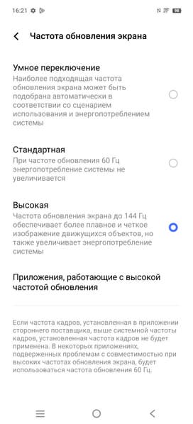 В настройках экрана можно включить режим с повышенной якобы до 144 Гц частотой обновления: