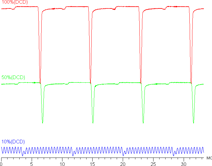 В англоязычной литературе и в новостях обычно используют название DC Dimming (на графиках сократим до DCD) для режима, когда указанная функция выключена. При выключении этой функции меняется только характер модуляции на высокой и средней яркости. Видимого мерцания как не было, так и нет. Приведем графики: