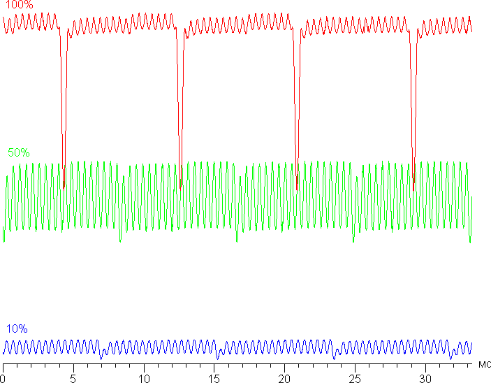 На любом уровне яркости присутствует значимая модуляция с частотой 120 Гц, к которой подмешивается дополнительной модуляция с высокой частотой (2160 Гц), и чем ниже яркость, тем выше доля высокочастотной составляющей. На рисунке ниже приведены зависимости яркости (вертикальная ось) от времени (горизонтальная ось) для нескольких значений настройки яркости: