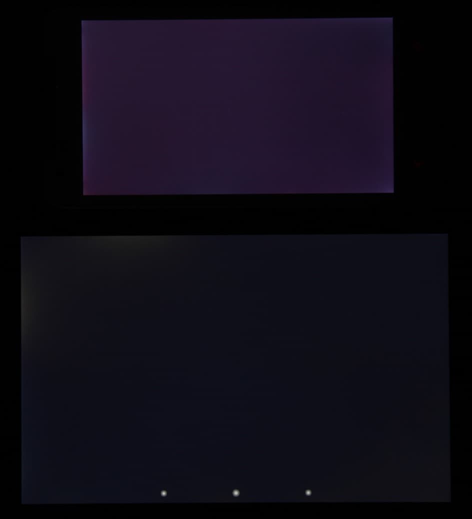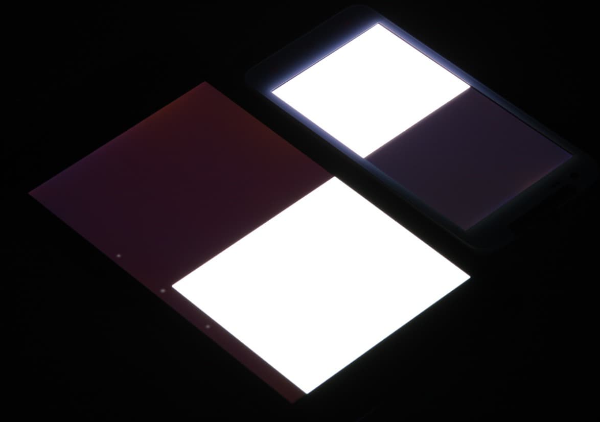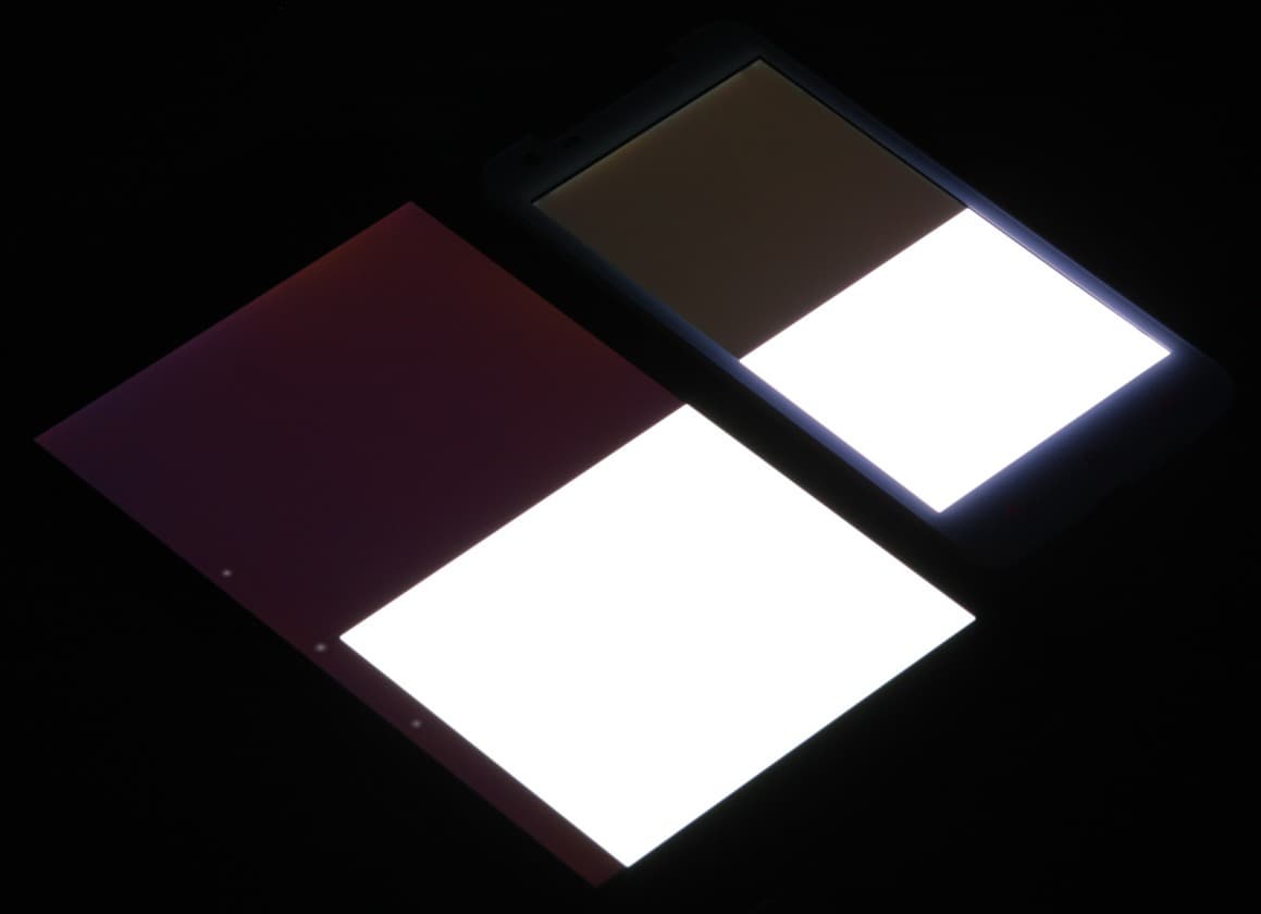 Яркость под углом у экранов уменьшилась (как минимум в 6 раз, исходя из разницы в выдержке) и уменьшилась примерно в одинаковой степени. Черное поле при отклонении по диагонали высветляется мало и приобретает красно-фиолетовый или желтоватый оттенок. Фотография с Nexus 7 для сравнения это показывает (яркость белых участков в перпендикулярном направлении у экранов одинаковая!):