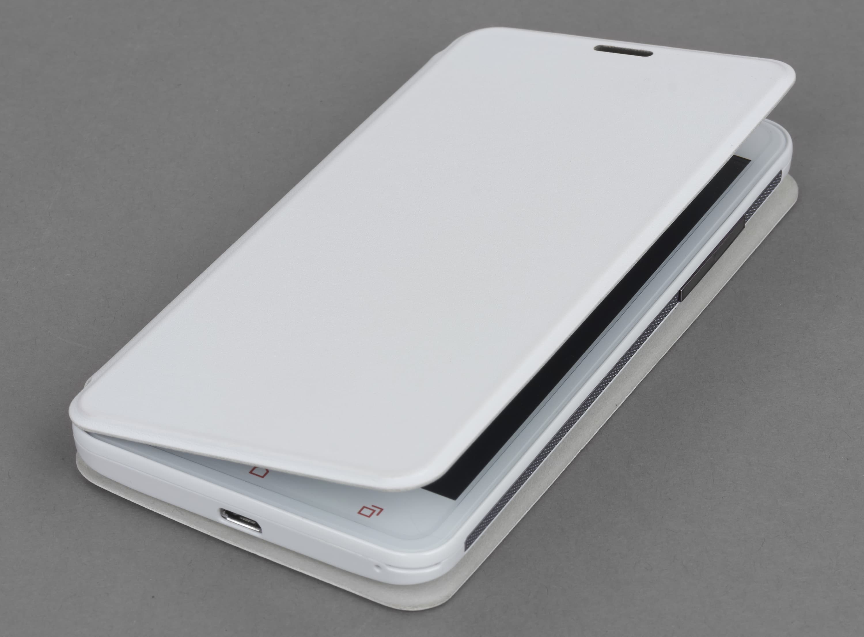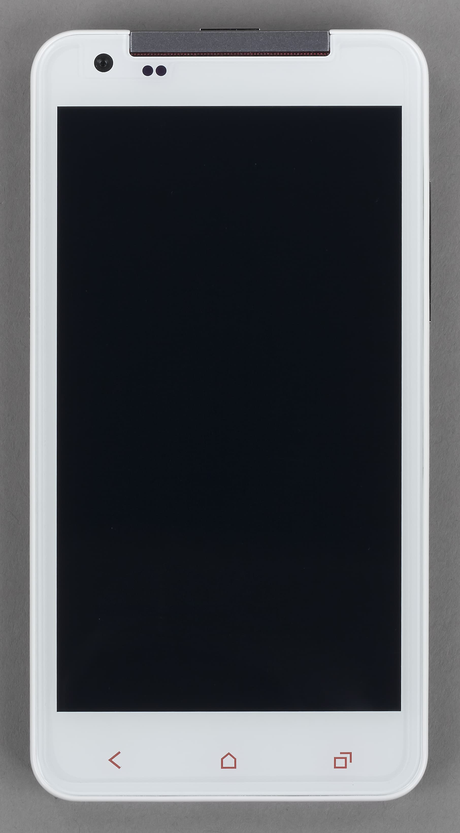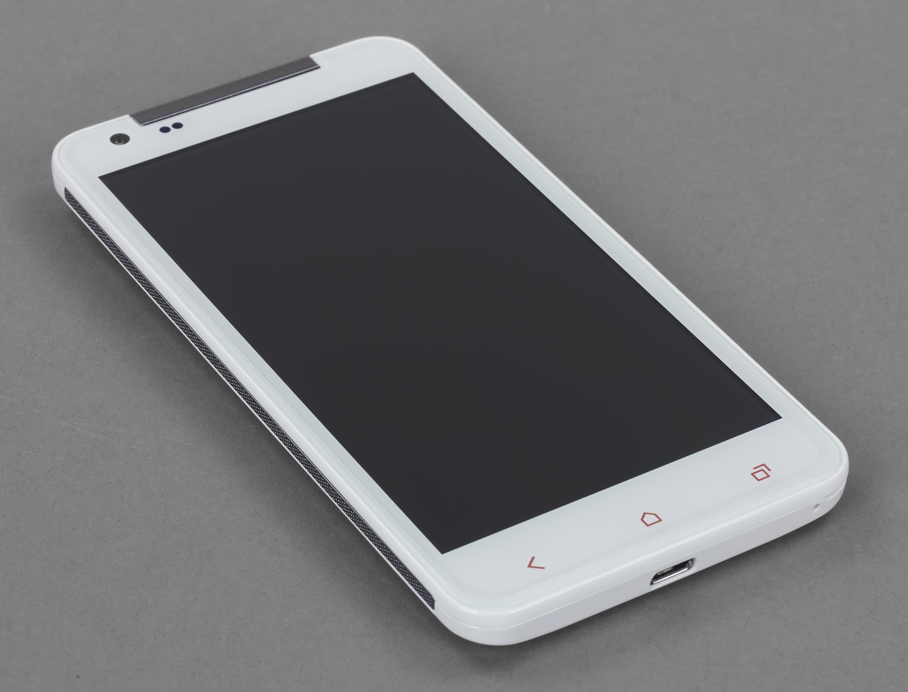 Расположение элементов внешнего облика на корпусе iRu M506 классическое. Основную площадь лицевой панели занимает дисплей, прикрытый заводской защитной пленкой, которую можно либо оставить, либо удалить. В нижней части лицевой панели находятся три сенсорные кнопки: переход на основной экран системы, вызов меню, возврат на шаг назад. Они подсвечиваются, мощность оранжевых светодиодов такова, что свет пробивается не только через линии пиктограмм, но и через окружающий их белый пластик лицевой панели смартфона. Над дисплеем расположены объектив дополнительной камеры, датчики света и приближения и декоративная пластиковая панель с прорезью для телефонного динамика. Именно этот зазор, скорее всего, станет основным «пылесборником» на лицевой панели смартфона и вообще во всем его корпусе. Каких-либо иных полостей, щелей, зазоров (естественно, за исключением интерфейсных разъемов) на поверхности iRu M506 нет.
