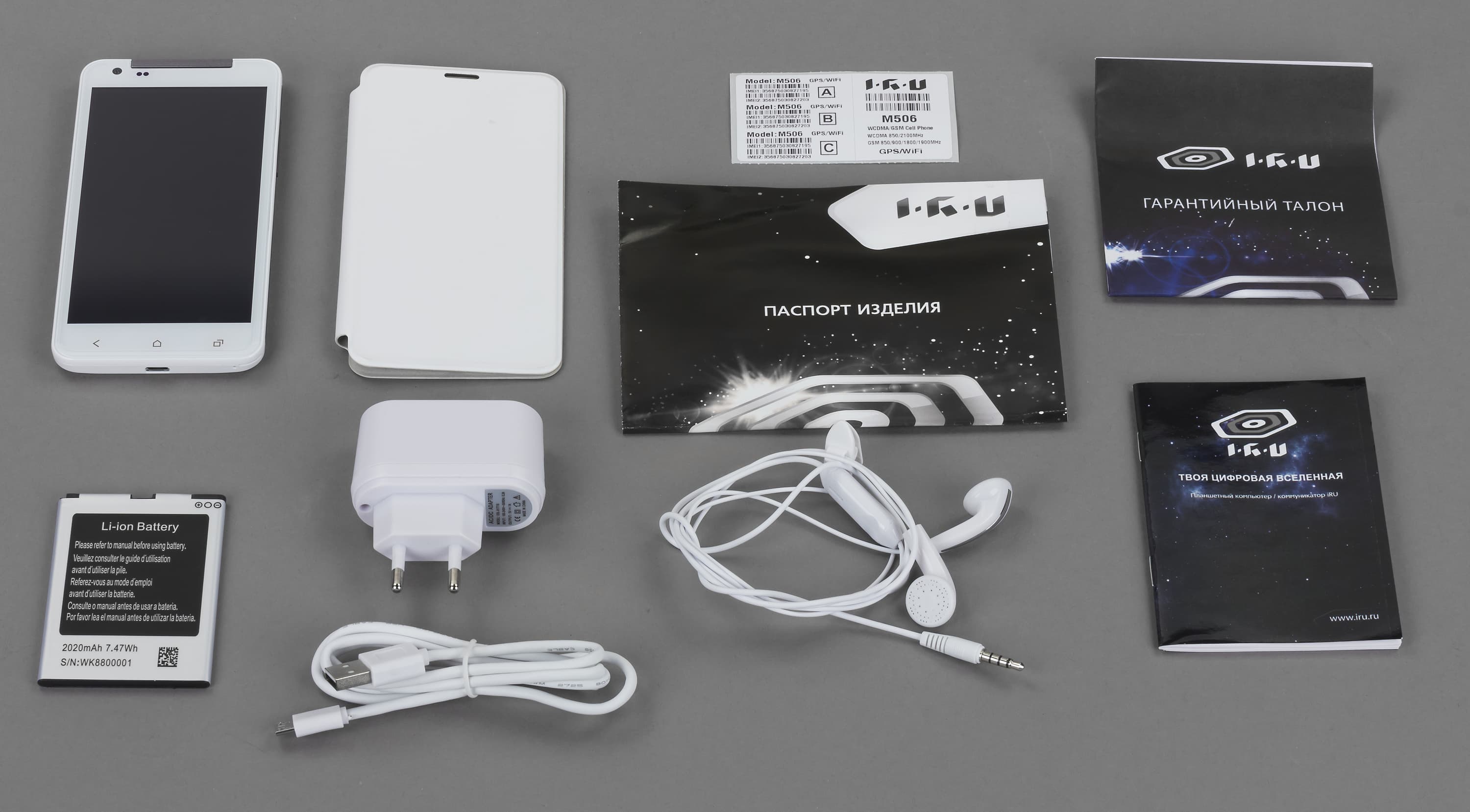 Содержимое упаковки: смартфон, две аккумуляторные батареи, чехол, зарядное устройство, кабель синхронизации, стереогарнитура, документация. Поскольку в этом разделе мы исследуем традиции iRu, то вот и хорошая: производитель комплектует большинство своих смартфонов дополнительным аккумулятором и чехлом — это безусловный плюс.
