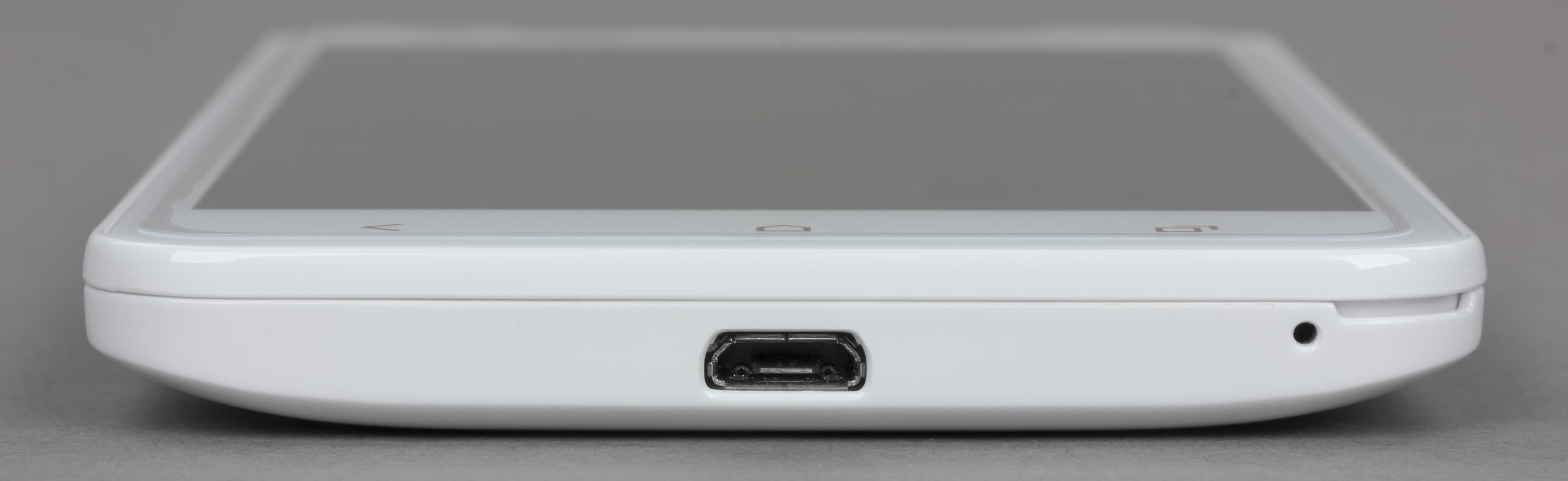 Рядом с кнопкой включения смартфона расположен разъем для подключения наушников. На нижнем торце iRu M506 находятся разъем Micro-USB и микрофон.