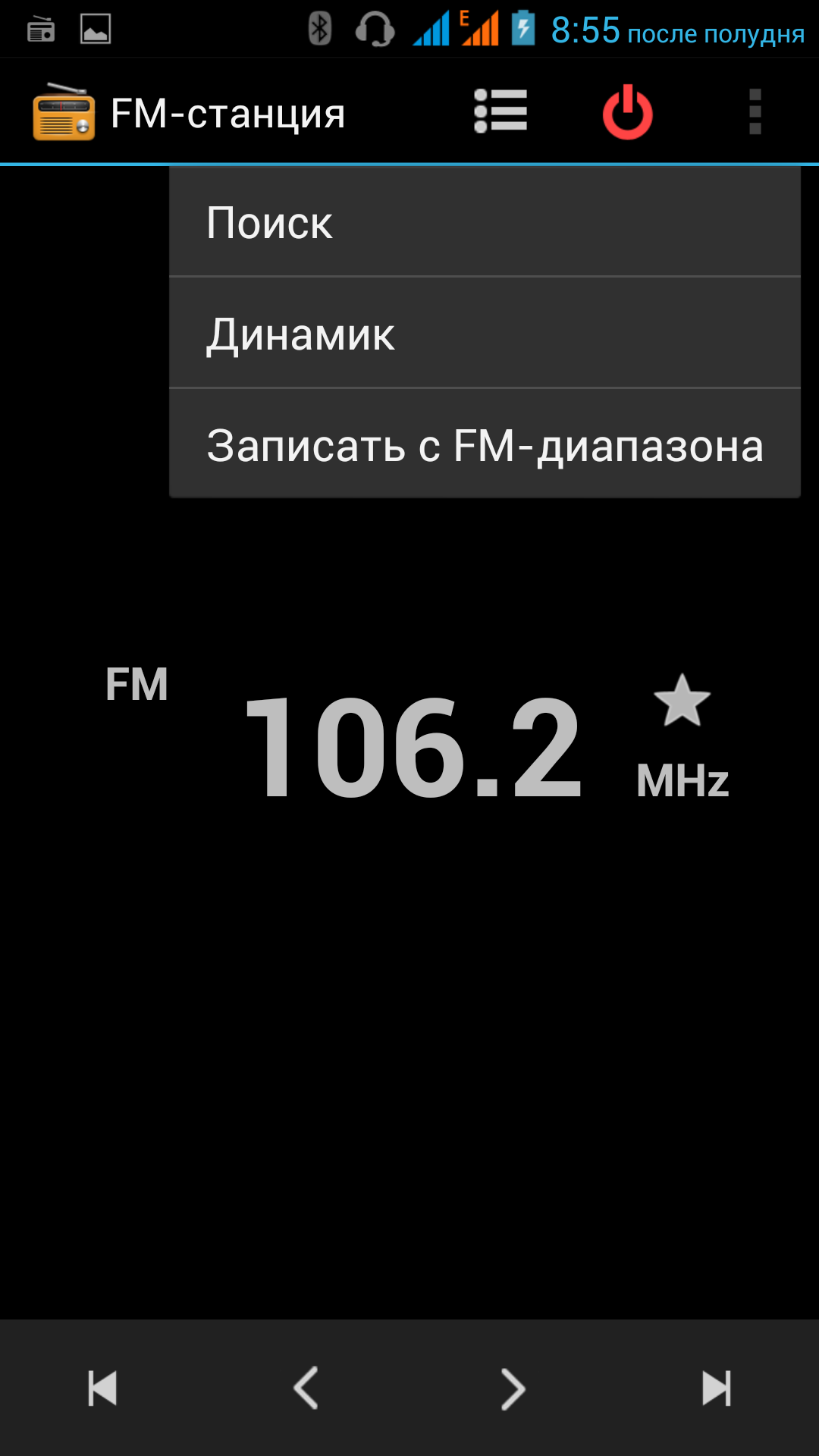 Подключенные наушники или гарнитура выполняют роль антенны для встроенного в смартфон радиоприемника FM-диапазона. Качество приема сигнала — посредственное. Программа управления радио встроена в ОС, доступны следующие функции: автоматический поиск станций, ручная подстройка частоты, создание списков станций, вывод звука на динамик смартфона, запись звука в файл. Поддержки RDS нет.