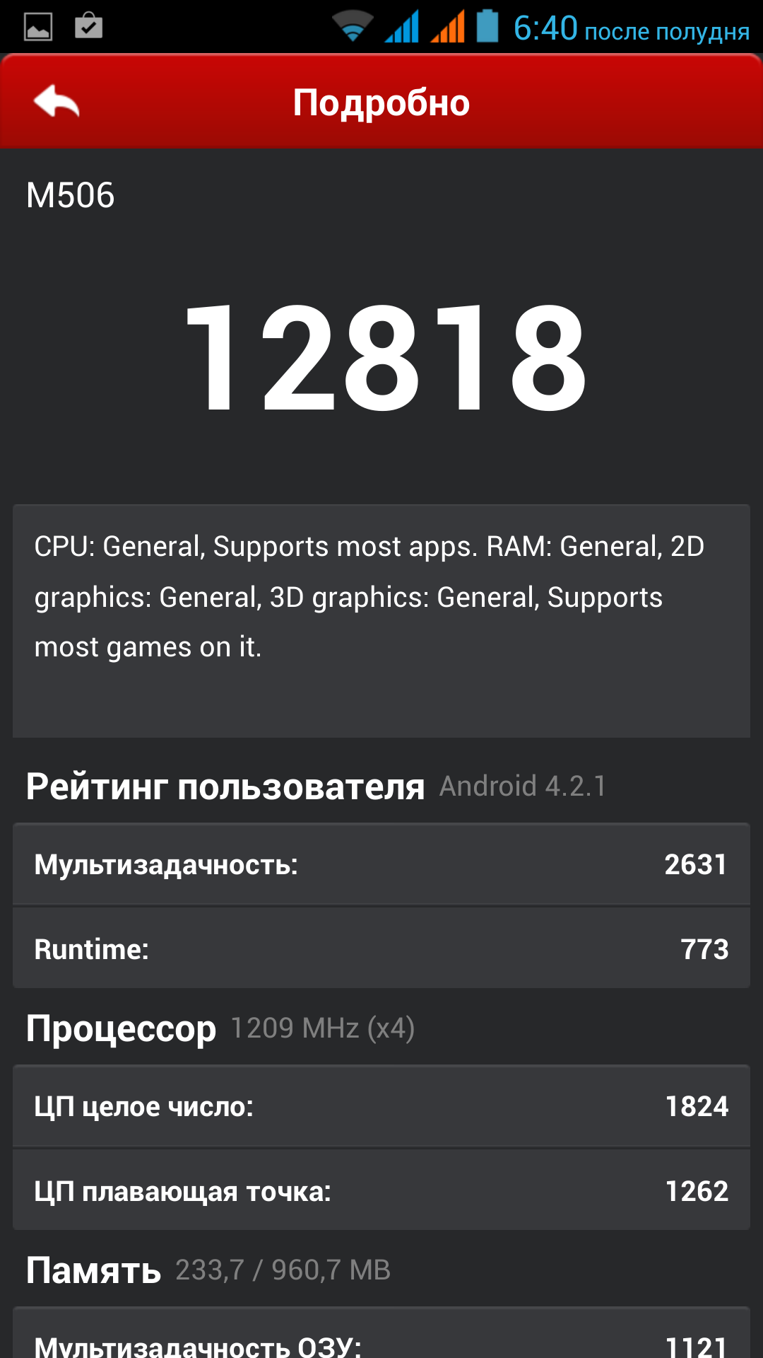Популярность платформы MediaTek MT6589 такова, что мы в редакции, пожалуй, собрали результаты тестов производительности практически всех возможных аппаратных конфигураций с ее участием. Есть в нашем арсенале тесты и в сочетании с 1 ГБ оперативной памяти и Full HD-дисплеем. Таким образом, ничего нового iRu M506 нам приподнести не сможет, если только его разработчики ничего не «напутали» с прошивкой. Посмотрим на результаты наших традиционных тестов.