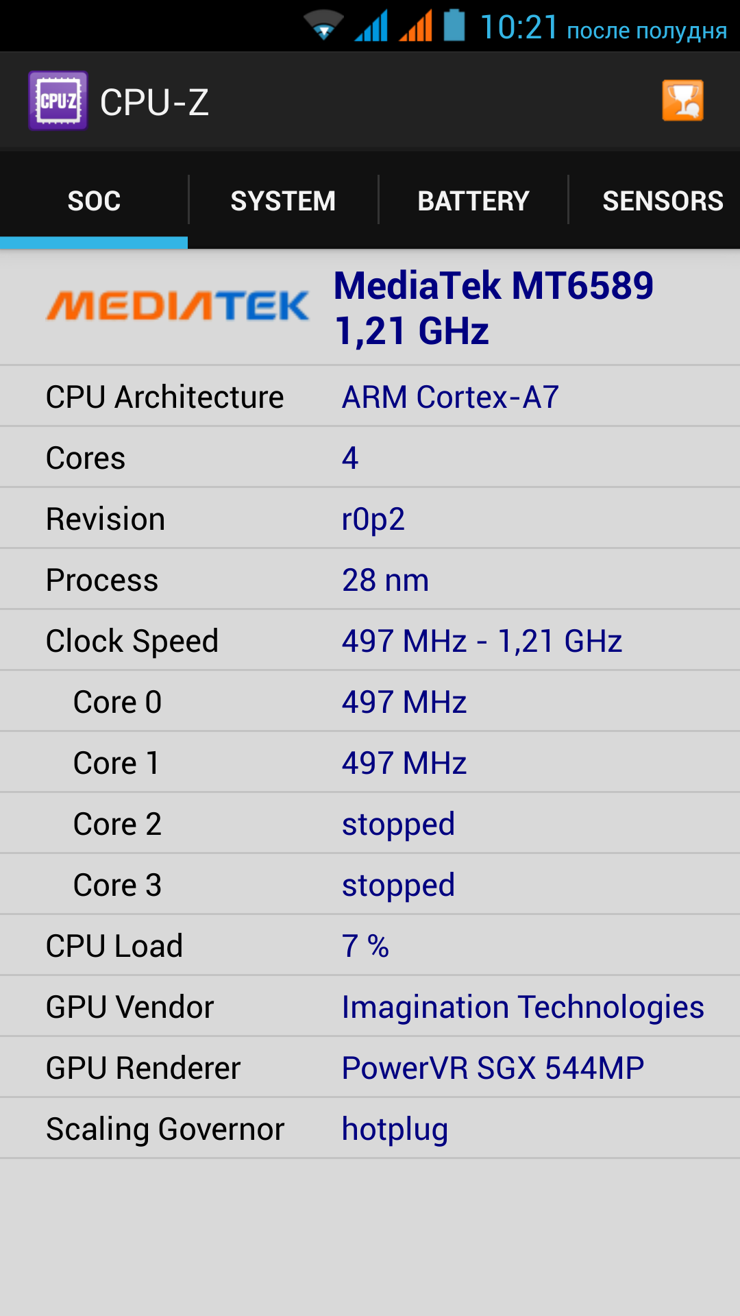 | SoC | MediaTek MT6589 (4 ядра ARM Cortex-A7) @1,2 ГГц | MediaTek MT6589 (4 ядра ARM Cortex-A7) @1,2 ГГц | MediaTek MT6589 (4 ядра ARM Cortex-A7) @1,2 ГГц | MediaTek MT6589 (4 ядра ARM Cortex-A7) @1,2 ГГц | MediaTek MT6589T (4 ядра ARM Cortex-A7) @1,5 ГГц |