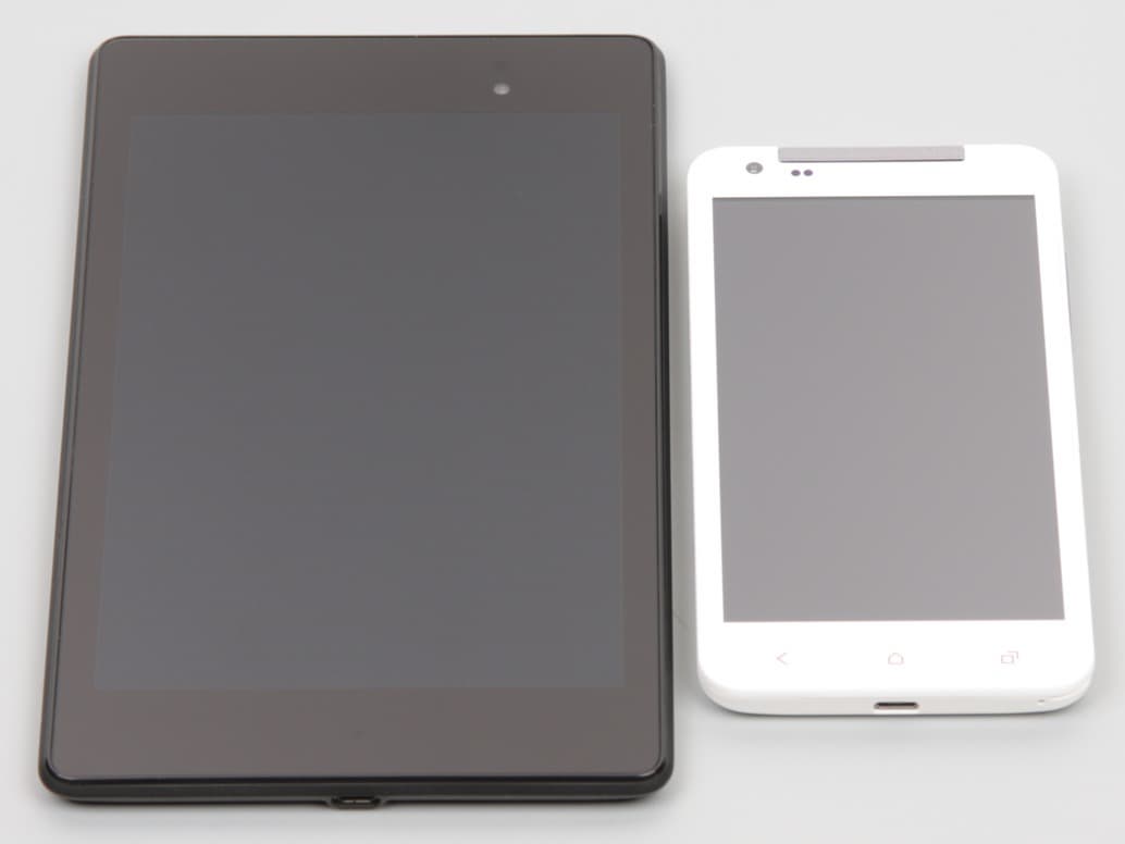 Лицевая поверхность экрана выполнена в виде стеклянной пластины с зеркально-гладкой поверхностью (слегка изогнутой к краям), устойчивой к появлению царапин. Судя по отражению объектов, имеется какой-то антибликовый фильтр, который по снижению яркости отражения заметно хуже, чем у Google Nexus 7 (2013) (далее просто Nexus 7). Для наглядности приведем фотографию, на которой в выключенных экранах отражается белая поверхность (слева — Nexus 7, справа — iRU M506, далее их можно различать по размеру):