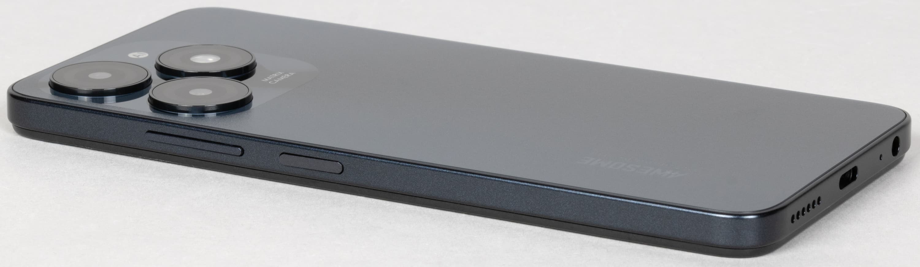 Материал корпуса - пластик, но смотрится так, словно задняя спинка из матового стекла с текстурированным покрытием. На такой поверхности не видны отпечатки пальцев, корпус практичный и не маркий. Боковая рамка не из металла, а тоже из матового пластика.