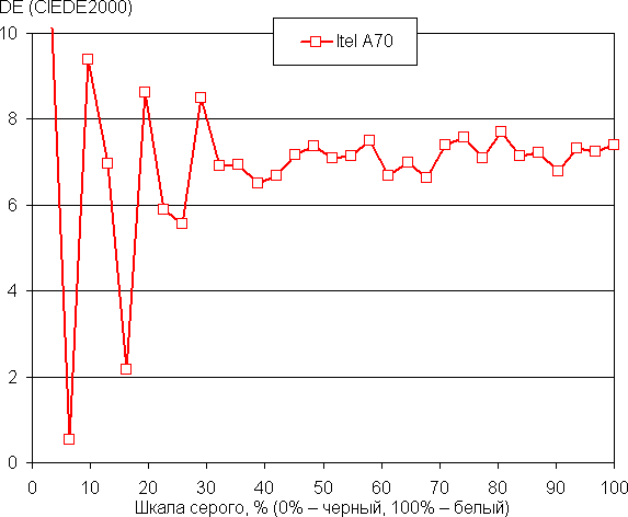 По умолчанию баланс оттенков на шкале серого компромиссный, так как цветовая температура существенно выше стандартных 6500 К и равна 9500 К на белом фоне. Спасает настройка, позволяющая снизить интенсивность синей компоненты.
