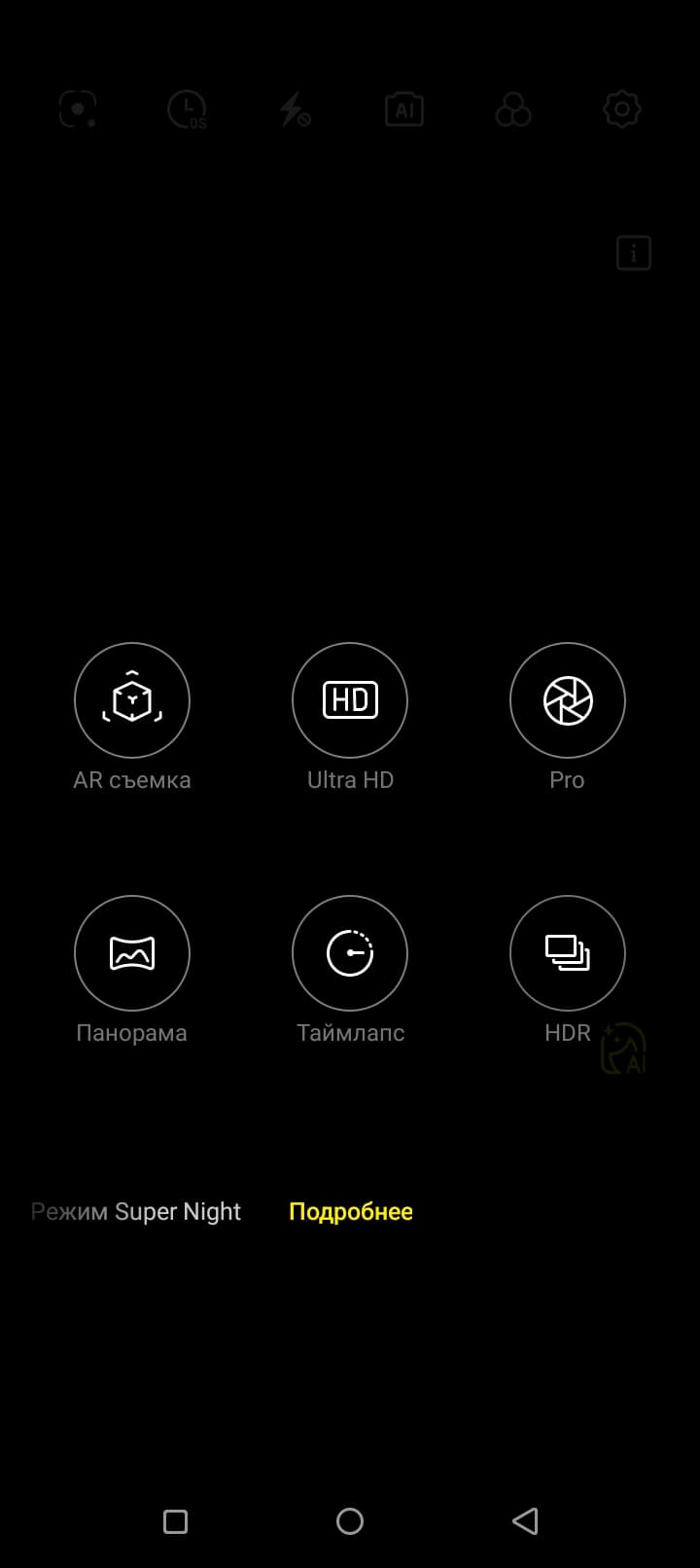 Интерфейс управления камерой очень прост и содержит лишь самые распространенные режимы: ручной, панорамный, таймлапс и режим дополненной реальности. Режим HDR также имеется, а функцию ИИ-обработки можно отключить, но визуально разницы почти нет.