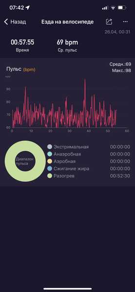 И третье: даже измерениям пульса мы бы доверяли с большой осторожностью. По утверждению браслета, самый высокий пульс во время езды был 100 ударов в минуту. Это совершенно неправдоподобно. Поездка была долгой и непростой — с тяжелыми подъемами в горку, стремительными спусками и пр.