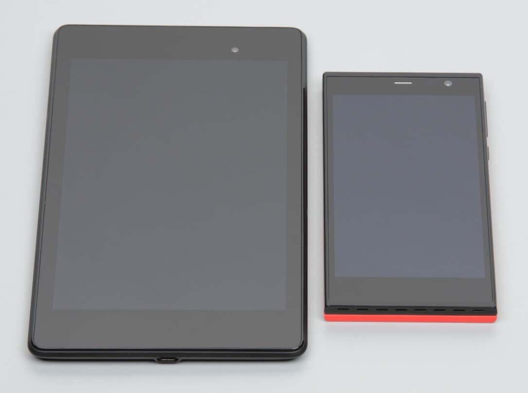Лицевая поверхность экрана выполнена в виде стеклянной пластины с зеркально-гладкой поверхностью, устойчивой к появлению царапин. Судя по отражению объектов, антибликовые свойства экрана не хуже, чем у экрана Google Nexus 7 (2013) (ниже просто Nexus 7). Для наглядности приведем фотографию, на которой в выключенных экранах отражается белая поверхность (слева — Nexus 7, справа — Jolla C, далее их можно различать по размеру):