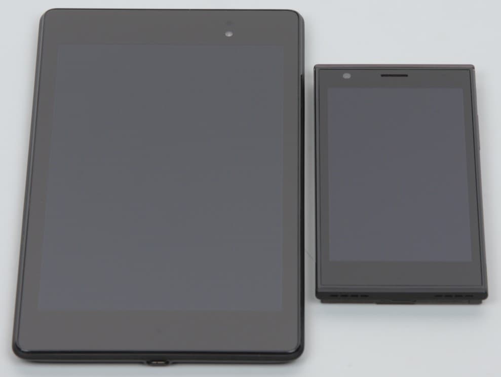 Лицевая поверхность экрана выполнена в виде стеклянной пластины с зеркально-гладкой поверхностью, устойчивой к появлению царапин. Судя по отражению объектов, имеется эффективный антибликовый фильтр, который по снижению яркости отражения не хуже, чем у Google Nexus 7 (2013) (далее просто Nexus 7). Для наглядности приведем фотографию, на которой в выключенных экранах отражается белая поверхность (слева — Nexus 7, справа — Jolla, далее их можно различать по размеру):