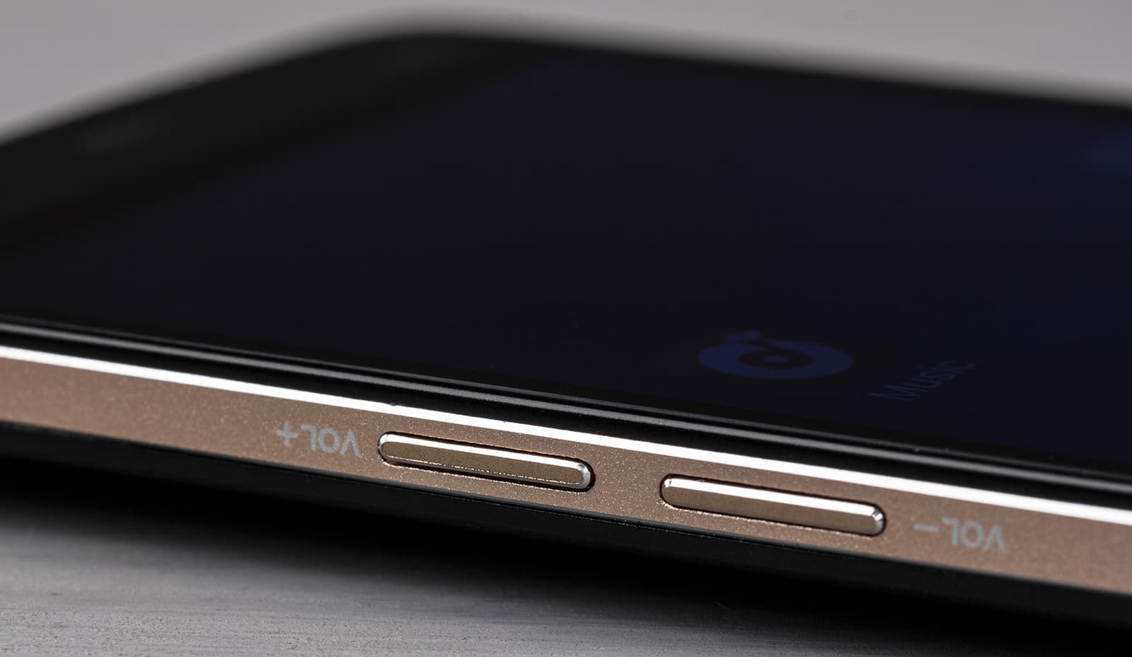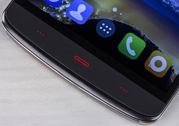 Передняя панель почти полностью прикрыта плоским защитным стеклом без бортиков. Согласно официальным обещаниям на сайте, это Corning Gorilla Glass 3, но кто ж им теперь на слово поверит. «Почти», потому что в самом низу остается неприкрытым этакий пластиковый наплыв — часть рамки вокруг экрана здесь значительно расширяется, немного усложняя таким образом дизайн, что в общем выглядит неплохо. Кнопки управления здесь сенсорные, имеют необычные пиктограммы из овала и троеточий, подсвечиваются кроваво-красным светом, что в целом вписывается в общую картину, создаваемую сочетанием золотистого металла и черного пластика. Надо признать, что белый вариант окраса Kingzone Z1 все же выглядит не столь эффектно, как этот черно-золотистый, на котором красные вставки оказываются более к месту.