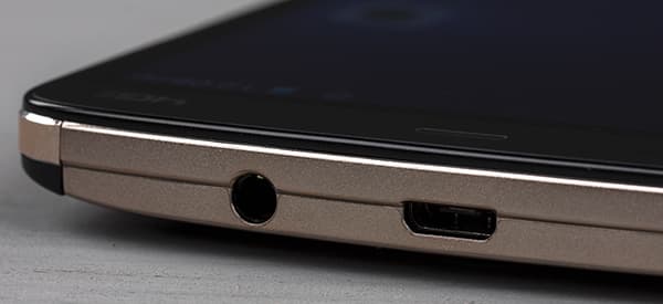 Универсальный разъем Micro-USB размещен на верхнем торце, аудиовыход для наушников 3,5 мм врезан сюда же. Расположены они, пожалуй, слишком уж близко друг к другу, и это может создать некоторые неудобства при одновременном подключении обоих штекеров. В качестве приятного бонуса разъем Micro-USB здесь еще и поддерживает режим подключения внешних устройств (USB OTG), так что через вложенный в комплект переходник можно подключить флэш-накопитель и считывать информацию прямо с него. Никаких заглушек на своих разъемах смартфон не имеет, так как не оборудован защитой от воды и грязи. Крепления для ремешка также не имеется.