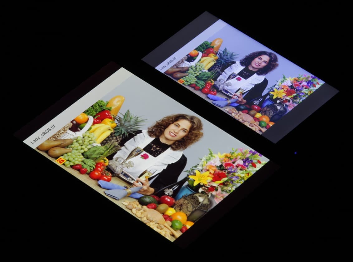 Экран имеет хорошие углы обзора без значительного сдвига цветов даже при больших отклонениях взгляда от перпендикуляра к экрану и без инвертирования (кроме самых-самых темных при отклонении по одной диагонали) оттенков. Для сравнения приведем фотографии, на которых на экраны Leagoo M5 Plus и Nexus 7 выведены одинаковые изображения, при этом яркость экранов изначально установлена примерно на 200 кд/м², а цветовой баланс на фотоаппарате принудительно переключен на 6500 К.