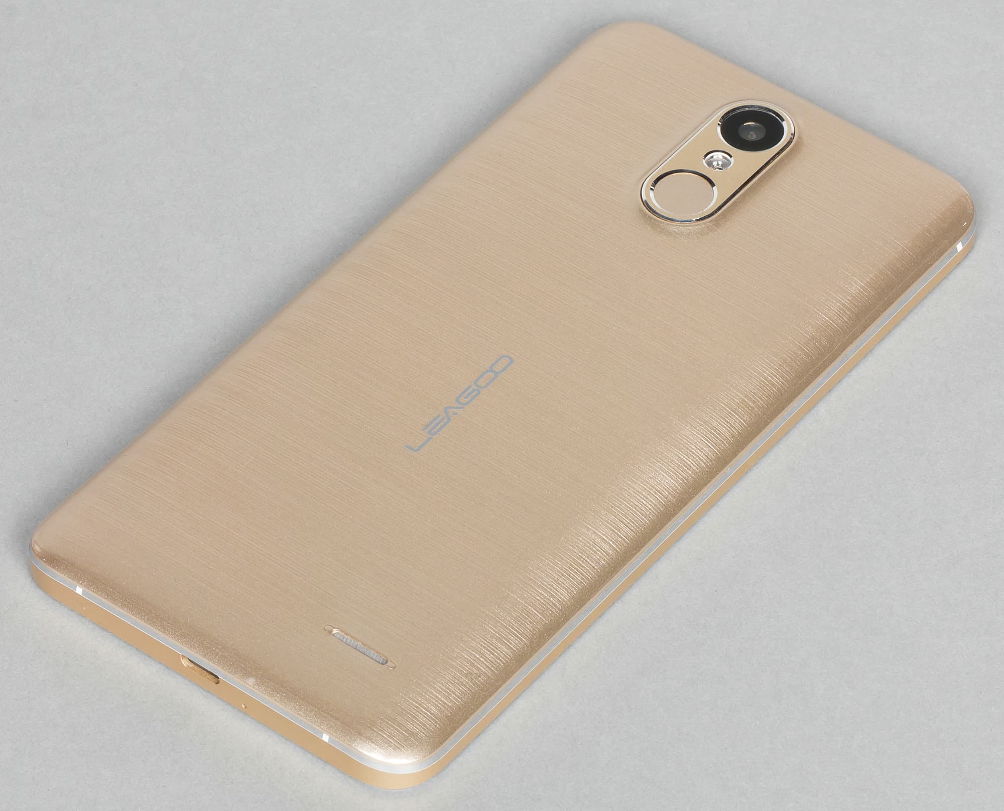 На деле оказывается, что крышка гладкая и лакированная, никакой шероховатой текстурированности шлифованного металла тут нет и в помине. А вот матовая и довольно массивная рама действительно выполнена из настоящего металла, и она обеспечивает большой вес аппарата — целых 208 граммов. Смартфон откровенно толстый и объемистый, однако батарейка здесь совсем маленькая, легкая. Столь тяжелая и громоздкая рама здесь применена потому, что Leagoo позиционирует свою серию M5 в качестве «противоударной» (shock-proof). Мы уже проводили эксперимент с моделью М5, и, к сожалению, ее «пуленепробиваемый» экран, которым якобы можно колоть орехи, от этих орехов сам раскалывается. Так что мы бы рекомендовали относиться к словам производителя с должным скепсисом.