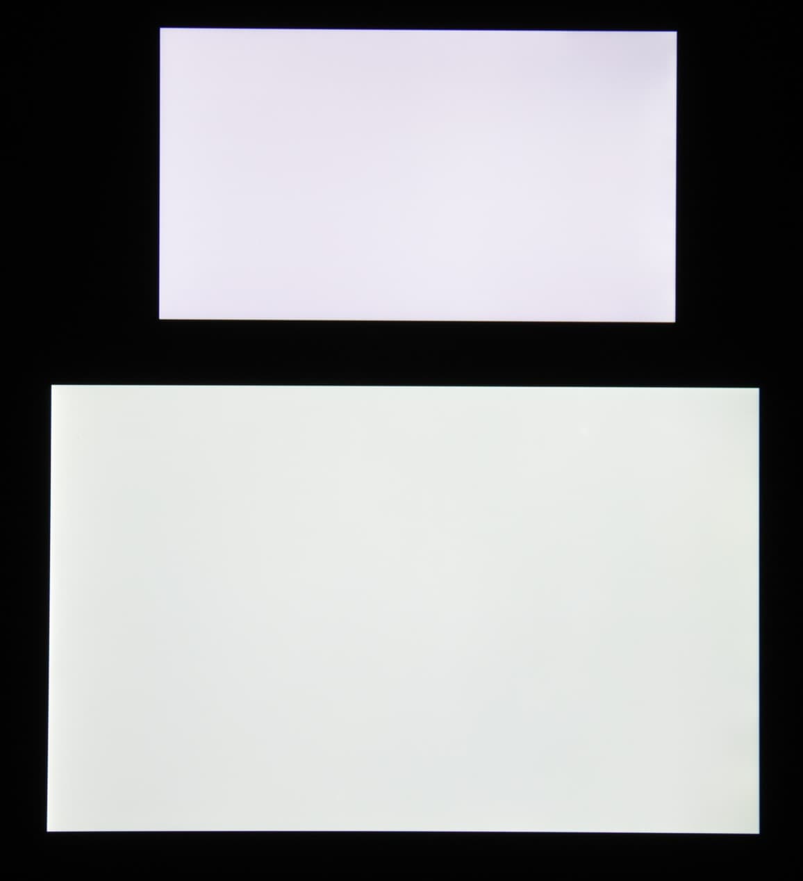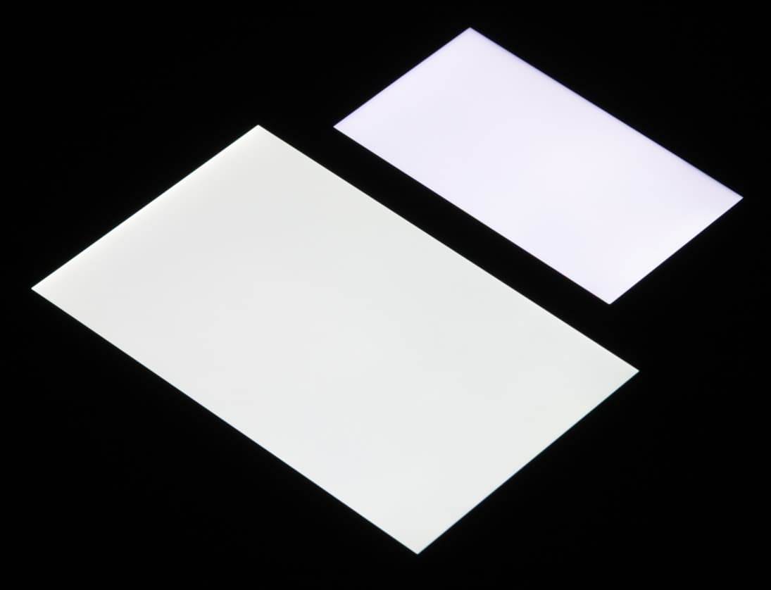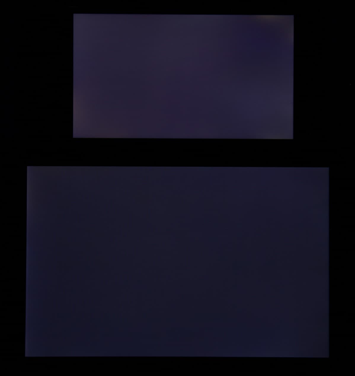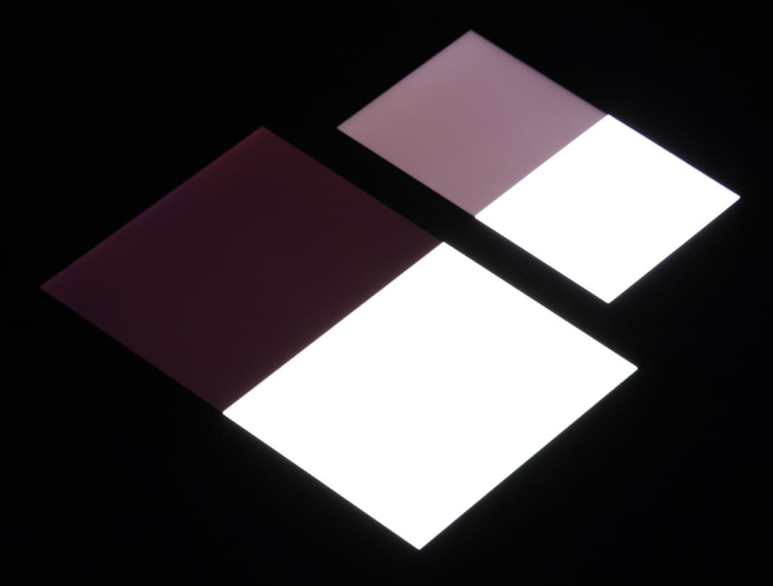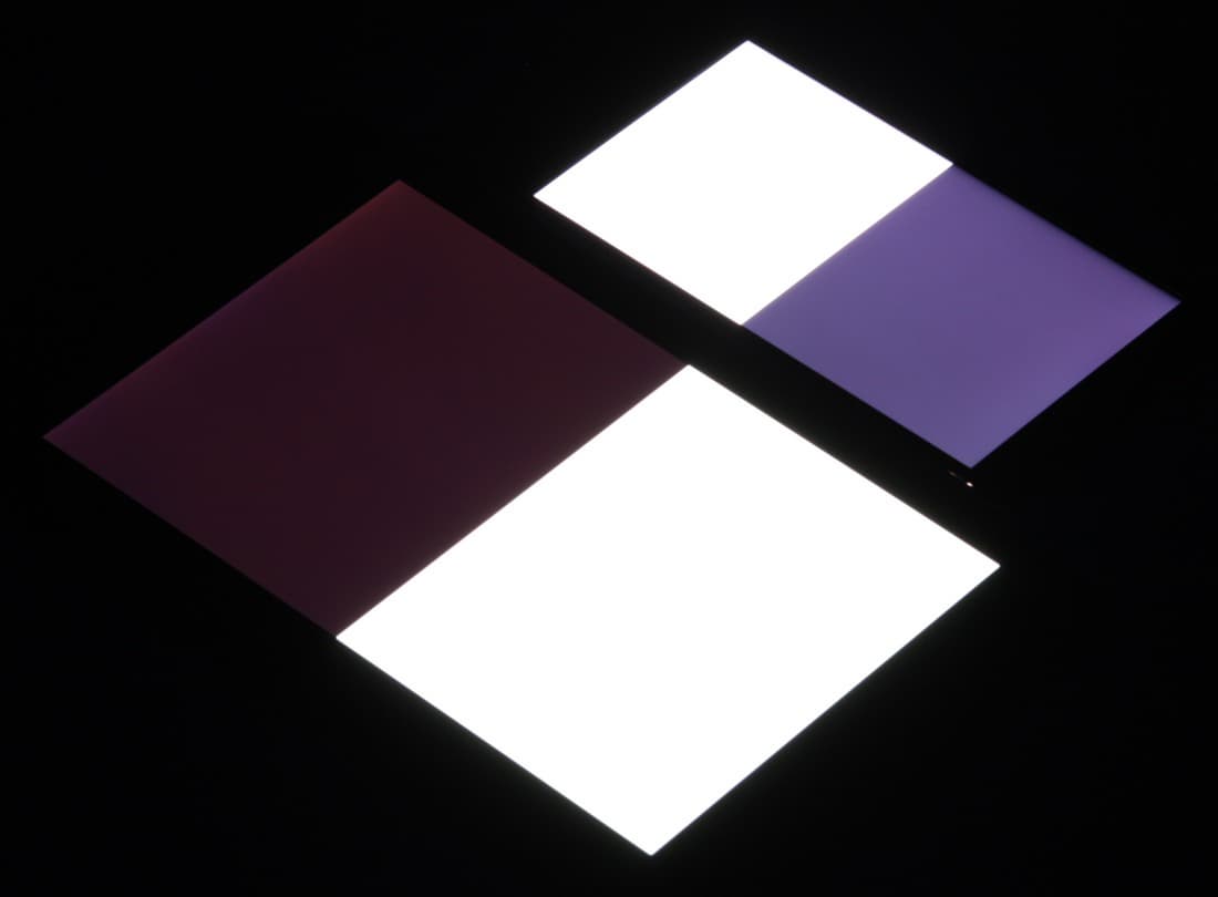 Яркость под углом у экранов уменьшилась (как минимум в 5 раз, исходя из разницы в выдержке), но у Leagoo M5 экран немного светлее. Черное поле при отклонении по диагонали высветляется сильно и приобретает фиолетовый или красно-фиолетовый оттенок. Фотографии ниже это демонстрируют (яркость белых участков в перпендикулярном плоскости экранов направлении одинаковая!):