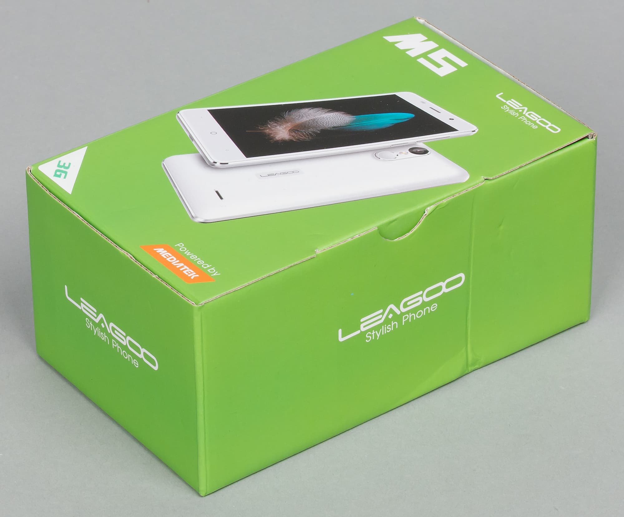 Leagoo M5 продается в небольшой картонной коробке стандартной прямоугольной формы. Упаковка очень проста, она собрана по местам сгиба без единой склейки, словно почтовая коробка для посылок. Аляповатое яркое оформление и довольно дешевый вид упаковки однозначно дают с первого же взгляда понять, что перед нами максимально бюджетный продукт без претензий.