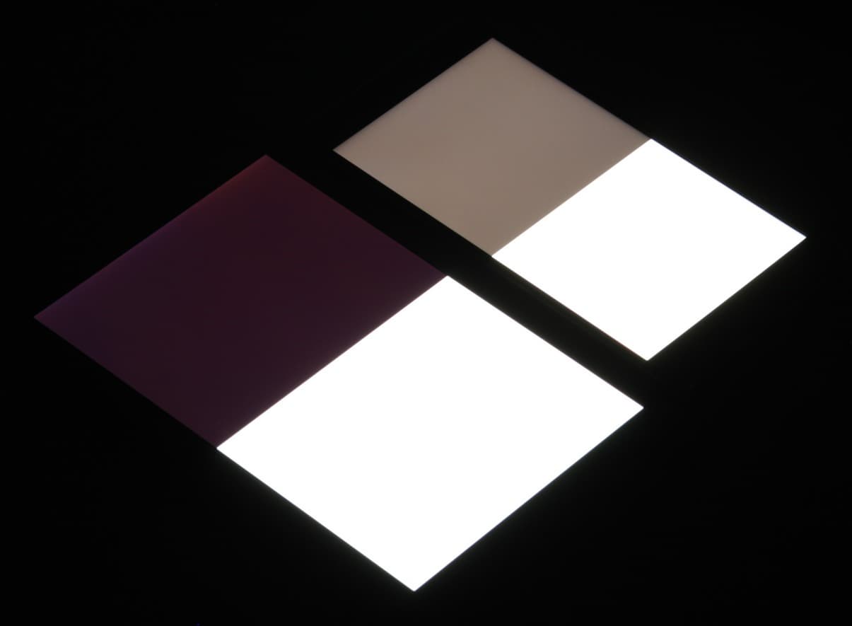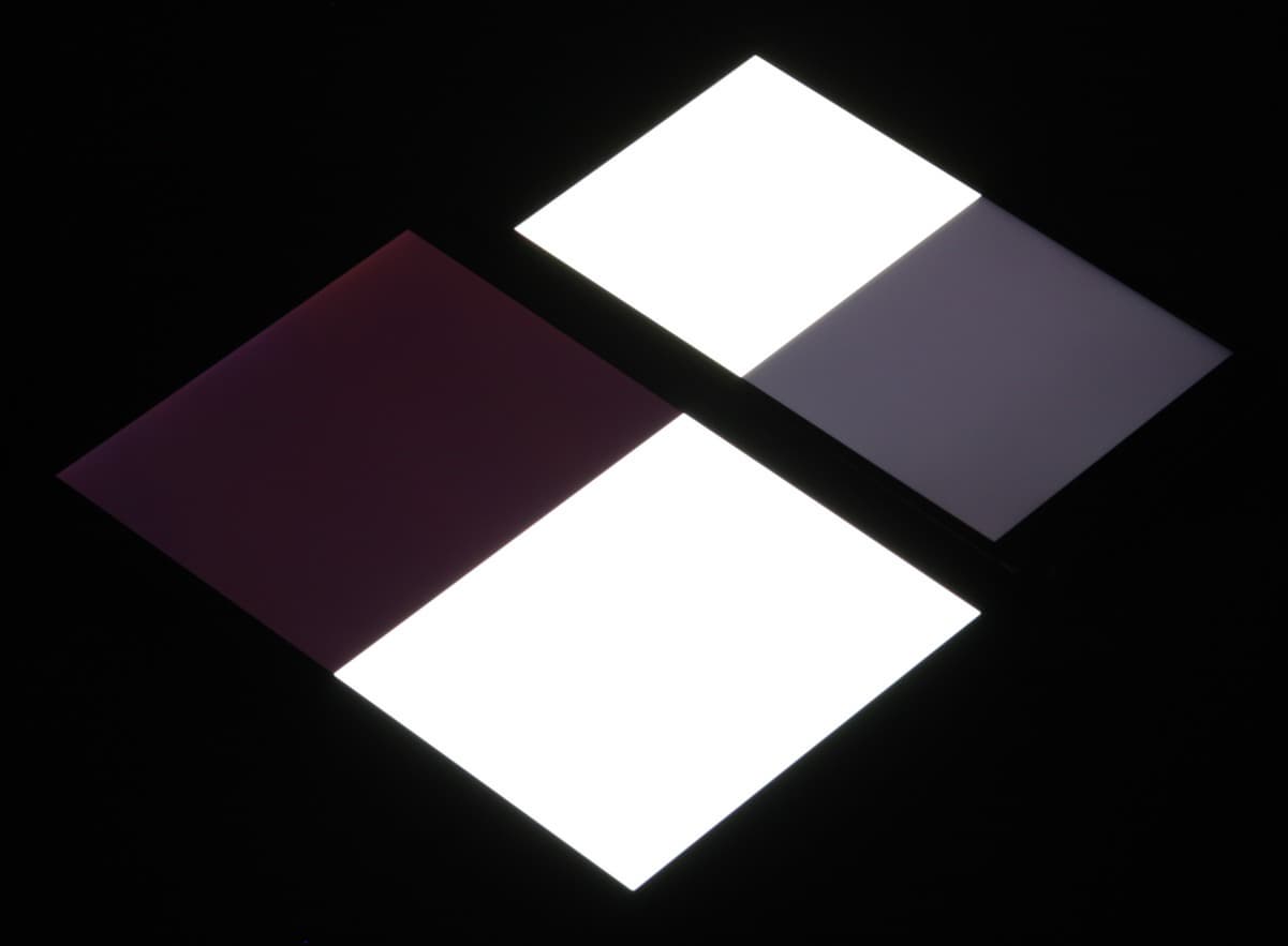 Яркость под углом у экранов уменьшилась (как минимум в 5 раз, исходя из разницы в выдержке), но у Leagoo M8 экран немного темнее. Черное поле при отклонении по диагонали высветляется сильно и приобретает фиолетовый или красноватый оттенок. Фотографии ниже это демонстрируют (яркость белых участков в перпендикулярном плоскости экранов направлении одинаковая!):
