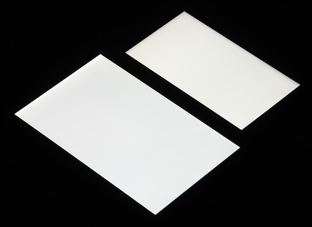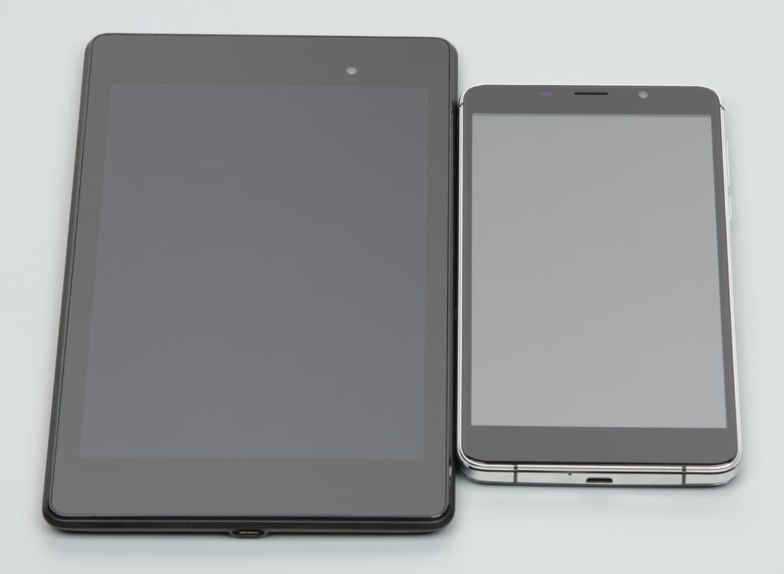 Лицевая поверхность экрана выполнена в виде стеклянной пластины с зеркально-гладкой поверхностью, устойчивой к появлению царапин. Судя по отражению объектов, антибликовые свойства экрана гораздо хуже, чем у экрана Google Nexus 7 (2013) (ниже просто Nexus 7). Для наглядности приведем фотографию, на которой в выключенных экранах отражается белая поверхность (слева — Nexus 7, справа — Leagoo M8, далее их можно различать по размеру):