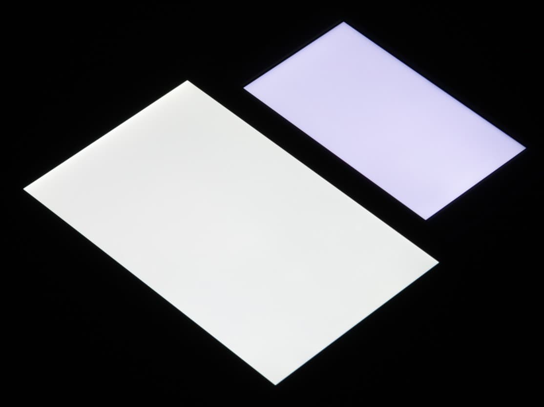 Яркость под углом у экранов уменьшилась (как минимум в 5 раз, исходя из разницы в выдержке), но у Leagoo T1 экран немного темнее. Черное поле при отклонении по диагонали высветляется сильно и приобретает фиолетовый или красно-фиолетовый оттенок. Фотографии ниже это демонстрируют (яркость белых участков в перпендикулярном плоскости экранов направлении одинаковая!):