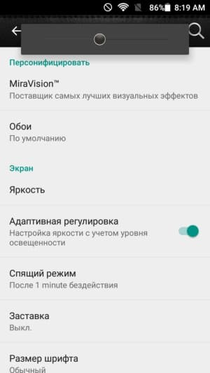 При ручном управлении яркостью и при выводе белого поля во весь экран максимальное значение яркости составило около 400 кд/м², минимальное — 20 кд/м². Максимальная яркость невысокая, но, учитывая хорошие антибликовые свойства, читаемость в солнечный день вне помещения будет приемлемой, также выручает режим с автоматической подстройкой яркости. В полной темноте яркость можно понизить до комфортного значения. В наличии автоматическая регулировка яркости по датчику освещенности (он находится правее глазка фронтальной камеры). В автоматическом режиме при изменении внешних условий освещенности яркость экрана как повышается, так и понижается. Работа этой функции не зависит от положения ползунка регулировки яркости. В полной темноте функция автояркости уменьшает яркость до 17 кд/м² (нормально), в условиях освещенного искусственным светом офиса (около 550 лк) устанавливает на 510 кд/м² (ярковато), в очень ярком окружении (соответствует освещению ясным днем вне помещения, но без прямого солнечного света — 20000 лк или немного больше) яркость повышается до 530 кд/м² (это гораздо выше, чем при ручной регулировке). Получается, что функция автоподстройки яркости работает неадекватно, но ее можно использовать, чтобы при необходимости дополнительно повысить яркость экрана. На любом уровне яркости значимая модуляция подсветки отсутствует, поэтому и нет никакого мерцания экрана.