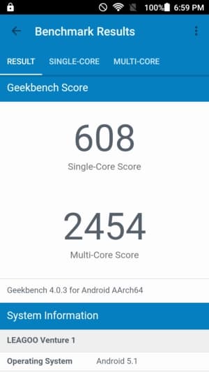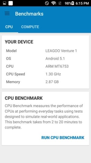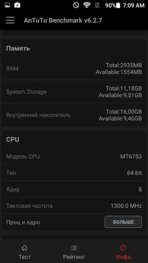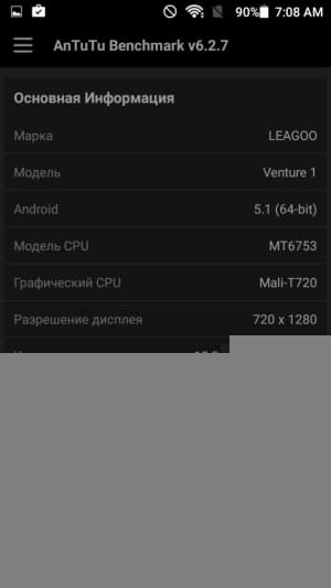 Аппаратная платформа Leagoo Venture 1 строится на базе SoC MediaTek MT6753. В конфигурацию данного чипа входит восемь процессорных ядер Cortex-A53, работающих на частоте до 1,3 ГГц. За обработку графики отвечает видеоускоритель Mali-T720. Объем ОЗУ составляет 3 ГБ, около 2,4 ГБ ОЗУ в реальности свободно после перезагрузки, очистки памяти и закрытия всех приложений. А вот места для файлов и приложений не так много: из 16 ГБ для нужд пользователя доступно не более 10,3 ГБ.