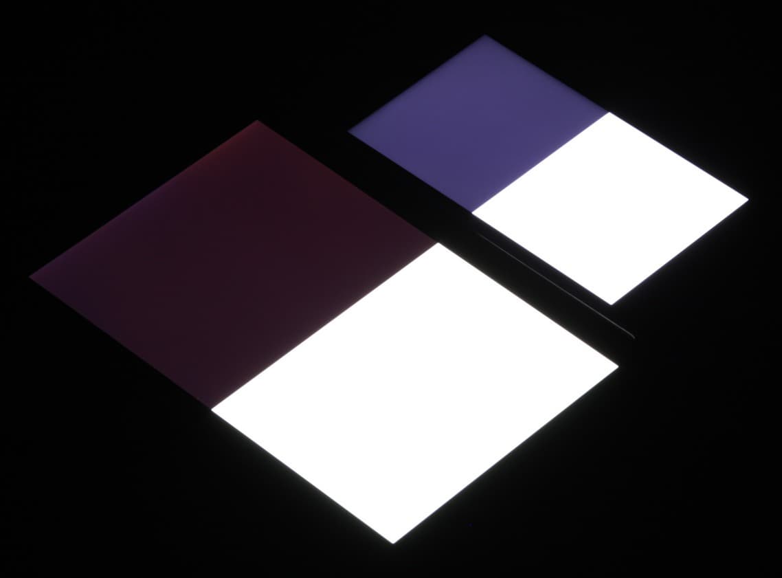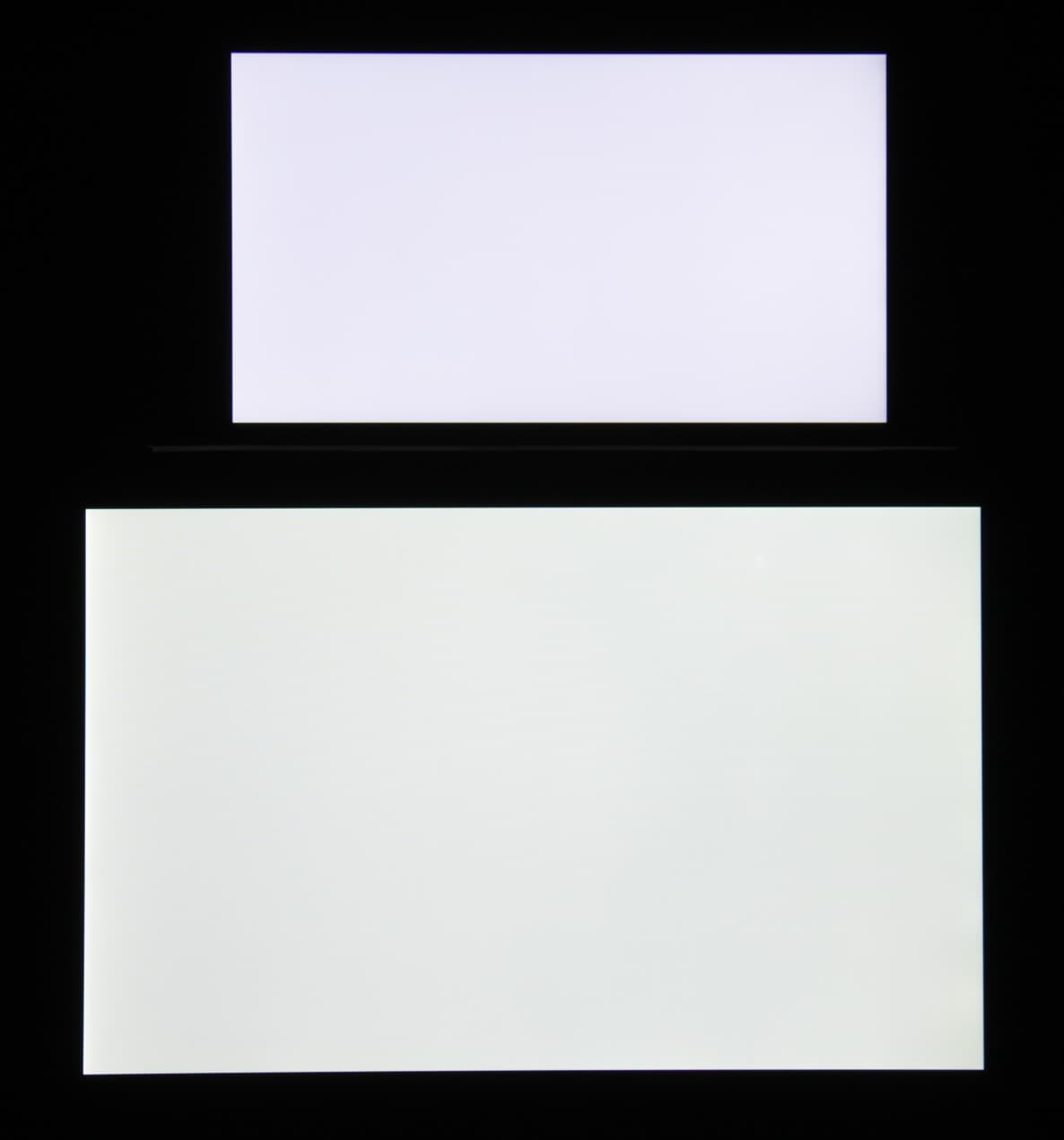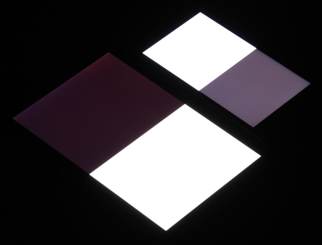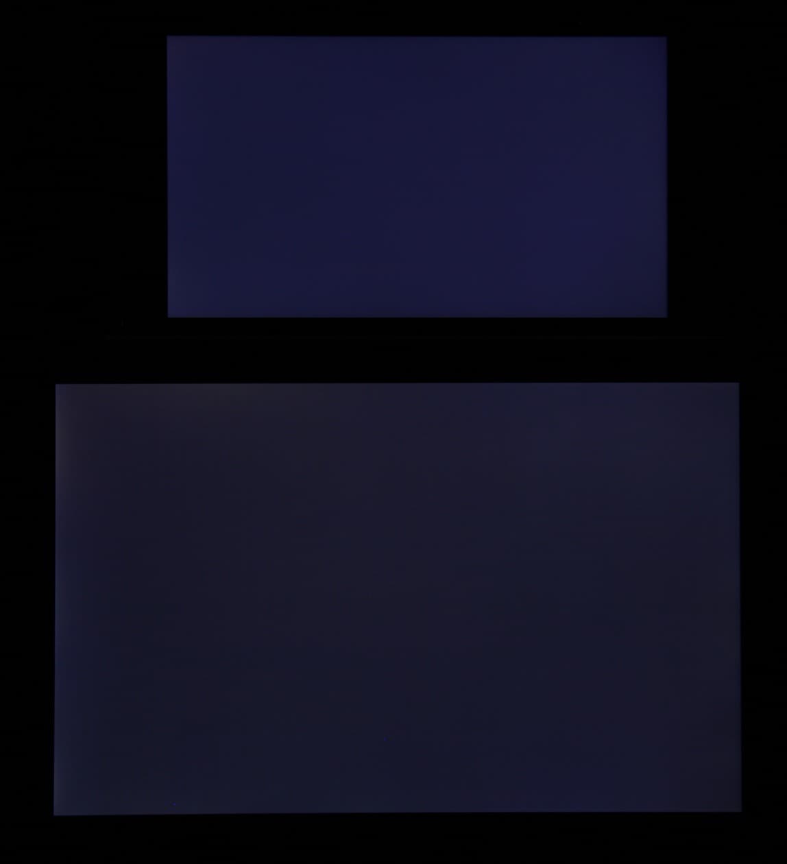 Яркость под углом у экранов уменьшилась (как минимум в 5 раз, исходя из разницы в выдержке), но у Leagoo Venture 1 экран немного темнее. Черное поле при отклонении по диагонали высветляется сильно и приобретает фиолетовый или красно-фиолетовый оттенок. Фотографии ниже это демонстрируют (яркость белых участков в перпендикулярном плоскости экранов направлении одинаковая!):