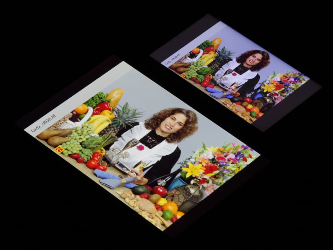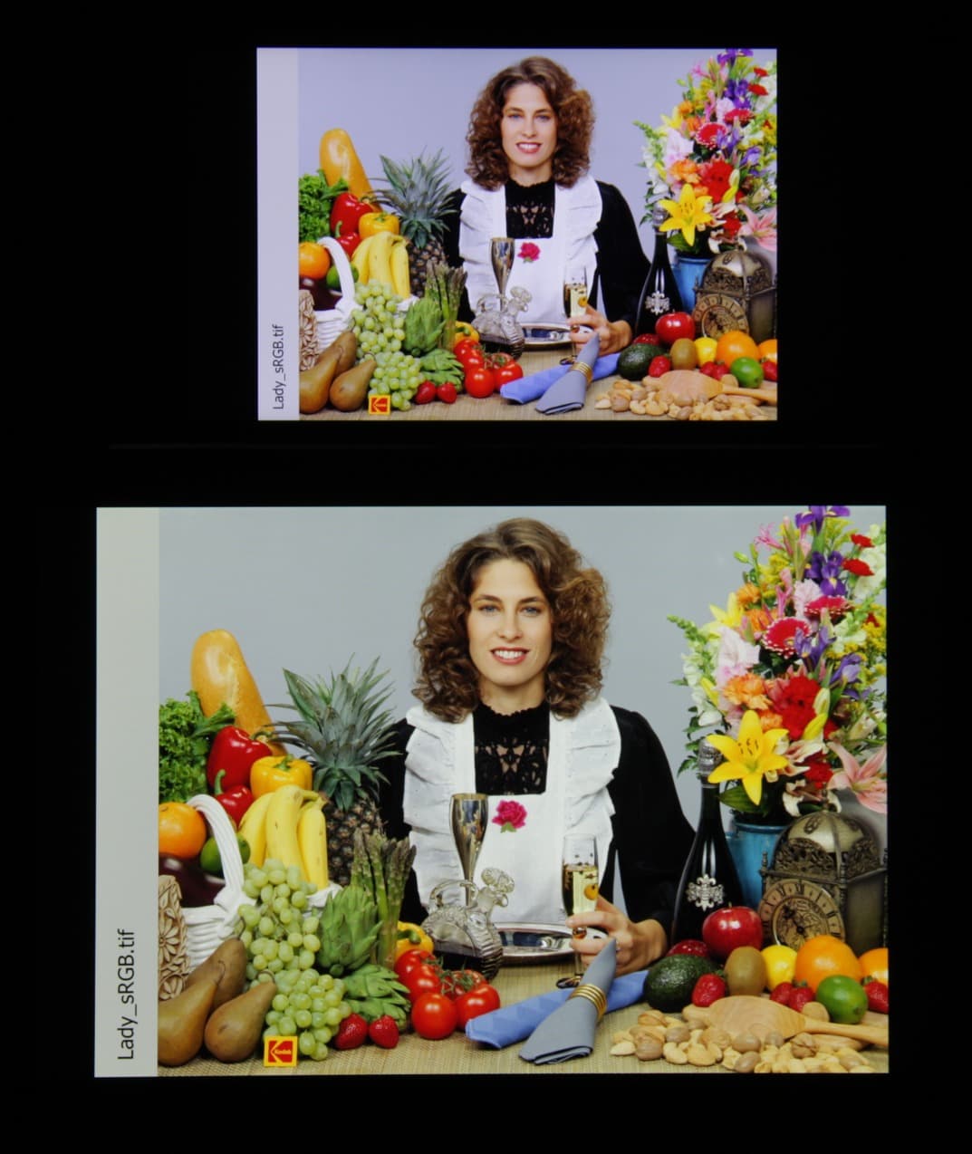 В итоге цвета имеют естественную насыщенность. Баланс оттенков на шкале серого средний, так как цветовая температура сильно выше стандартных 6500 К, но отклонение от спектра абсолютно черного тела (ΔE) порядка 10, что для потребительского устройства считается приемлемым показателем. При этом цветовая температура и ΔE мало изменяются от оттенка к оттенку — это положительно сказывается на визуальной оценке цветового баланса. (Самые темные области шкалы серого можно не учитывать, так как там баланс цветов не имеет большого значения, да и погрешность измерений цветовых характеристик на низкой яркости большая.)