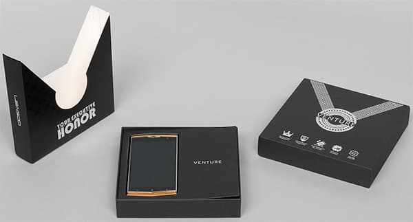 Упаковка у Leagoo Venture 1 своеобразная, как и сам аппарат: многие китайские производители пытались преподнести свои поделки в люксовом стиле, и большинству из них упаковки давались лучше этой. Здесь совершенно обыкновенная плоская картонная коробка из простого гладкого картона грубо выкрашена в яркий черный цвет без матовой глубины, добавлены блестящие серебристые надписи, рисунки и логотипы, но их слишком много и они чрезмерно крупные.