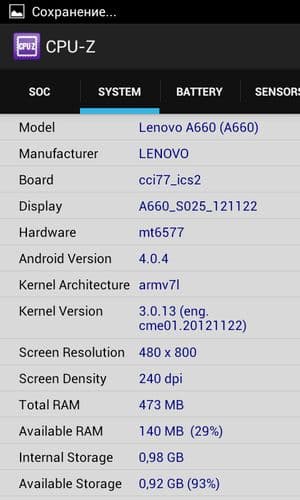 Аппаратная платформа Lenovo A660 строится на базе однокристальной системы (SoC) MediaTek MT6577. Центральный процессор имеет 2 ядра Cortex-A9, работающих на частоте 1 ГГц. Помощь в обработке графики ему оказывает видеопроцессор GPU PowerVR SGX 531. Оперативной памяти в устройстве предусмотрено лишь 512 МБ. Хранилище, доступное пользователю для загрузки собственных файлов, изначально составляет около гигабайта из номинально обозначенных 4 ГБ внутренней памяти, но имеется возможность расширения памяти за счет карт microSD. Любопытно, что диспетчер файлов определяет установленную карту памяти как внутреннюю, а собственную встроенную память называет «Внешняя карта памяти». Это, конечно, сильно вводит в заблуждение. Режим подключения внешних устройств к порту USB (USB Host) здесь не поддерживается.