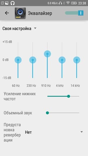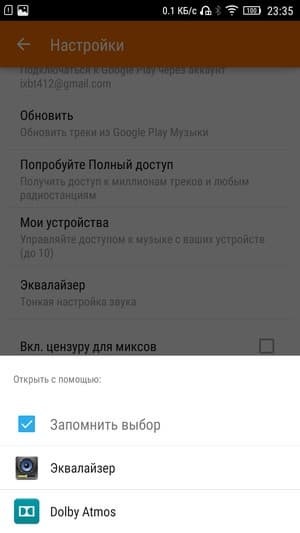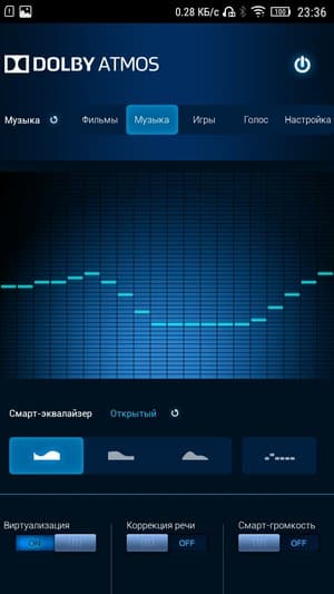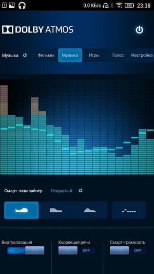 В пресс-релизах особенно отмечается наличие в Lenovo A7000 фирменной технологии улучшения звука Dolby Atmos, однако на деле это всего лишь маркетинг. Никакого множества динамиков в аппарате, естественно, нет, динамик здесь только один, и он издает достаточно простенький по спектру частот, хоть и громкий звук. В наушниках звук еще громче, можно поиграться с предустановленными значениями фирменного эквалайзера Dolby, хотя имеется и альтернативное решение в виде штатного проигрывателя Google Play Music со своим собственным эквалайзером.