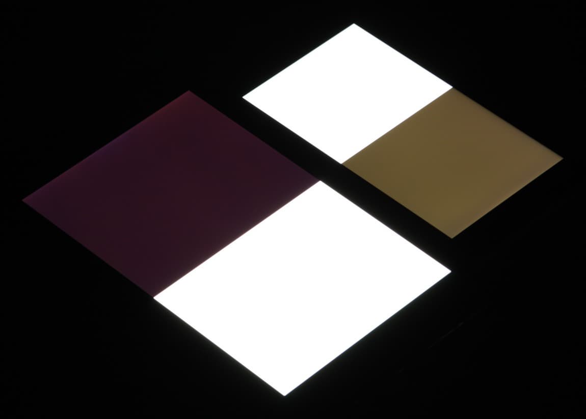 Яркость под углом у экранов уменьшилась (как минимум в 5 раз, исходя из разницы в выдержке), но в случае Lenovo A7000 падение яркости больше. Черное поле при отклонении по диагонали высветляется сильно и приобретает желтоватый или красно-фиолетовый оттенок. Фотографии ниже это демонстрируют (яркость белых участков в перпендикулярном плоскости экранов направлении примерно одинаковая!):