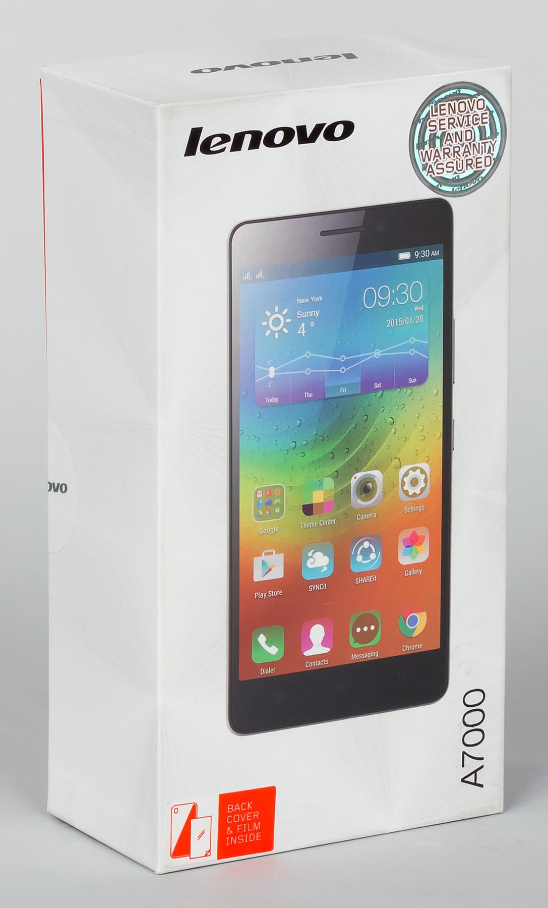 Смартфон Lenovo A7000 поставляется в продажу в привычной для бюджетных продуктов Lenovo упаковке из твердого нелакированного светлого картона. Коробка оформлена дешево: разноцветные картинки на белом фоне заметно снижают уровень восприятия продукта, на премиальность здесь намеков нет, бюджетный смартфон имеет соответствующую по уровню упаковку.