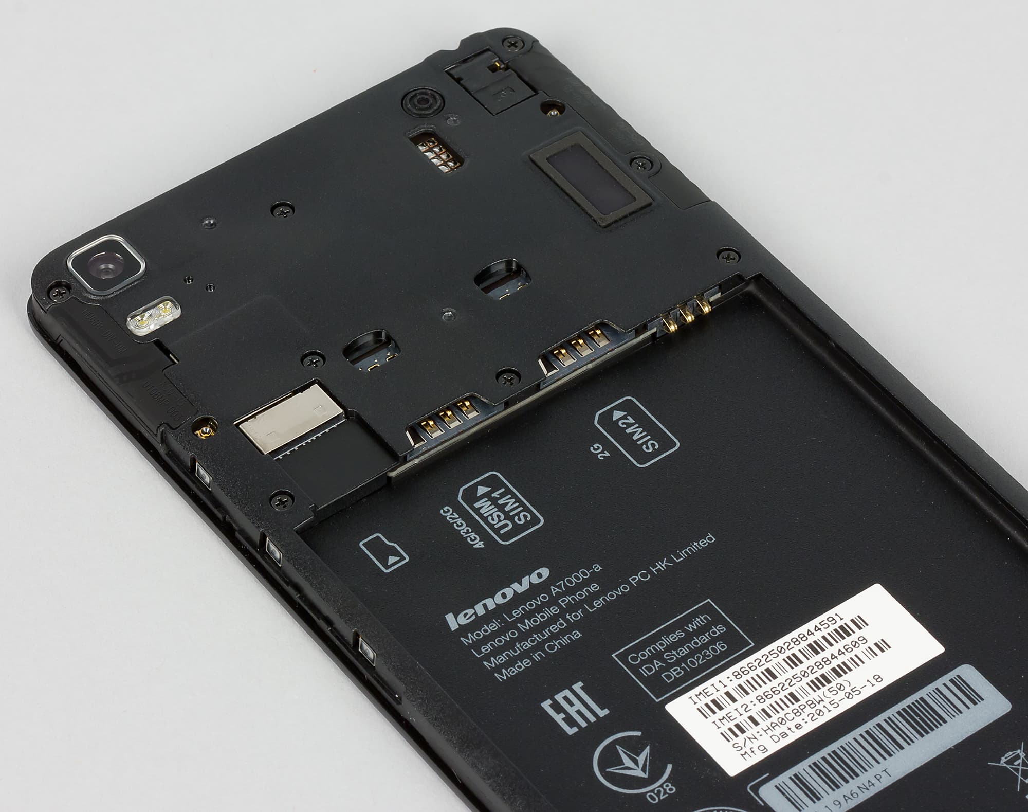 Под крышкой расположены три разъема для карточек, два из которых предназначены для SIM-карт формата Micro-SIM, а в третий вставляется карта памяти формата microSD. Если вы пользуетесь карточкой формата Nano-SIM с переходником, то в случае с Lenovo A7000 установить ее будет весьма непросто, здесь предусмотрен один из самых неудобных вариантов установки SIM-карт. Застрявшую карточку можно подтолкнуть с обратной стороны через предусмотренное для этого отверстие. Слоты неравнозначны между собой, лишь один поддерживает работу с сетями 4G.