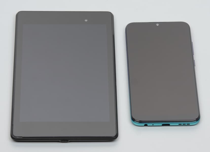Лицевая поверхность экрана выполнена в виде стеклянной пластины с зеркально-гладкой поверхностью, устойчивой к появлению царапин. Судя по отражению объектов, антибликовые свойства экрана лучше, чем у экрана Google Nexus 7 (2013) (далее просто Nexus 7). Для наглядности приведем фотографию, на которой в выключенных экранах отражается белая поверхность (слева — Nexus 7, справа — Lenovo K10 Plus, далее их можно различать по размеру):
