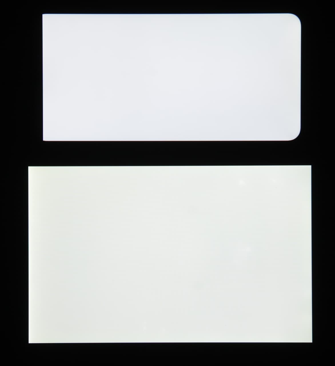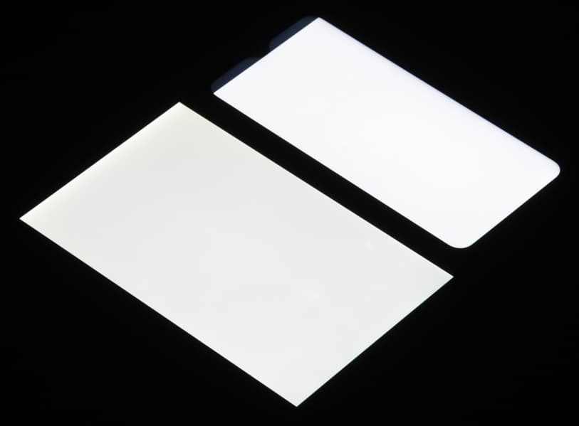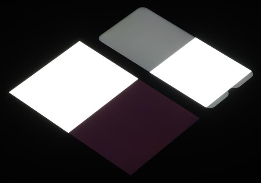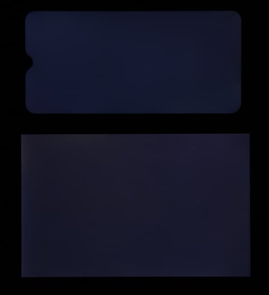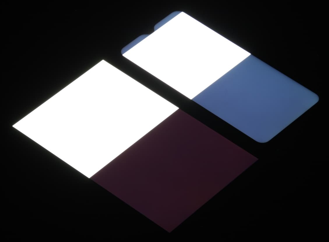 Яркость под углом у экранов уменьшилась (как минимум в 4 раза, исходя из разницы в выдержке), но у Lenovo K10 Plus яркость под этим углом все же выше. Черное поле при отклонении по диагонали сильно высветляется и приобретает легкий фиолетовый оттенок или остается условно нейтрально-серым. Фотографии ниже это демонстрируют (яркость белых участков в перпендикулярном плоскости экранов направлении одинаковая!):