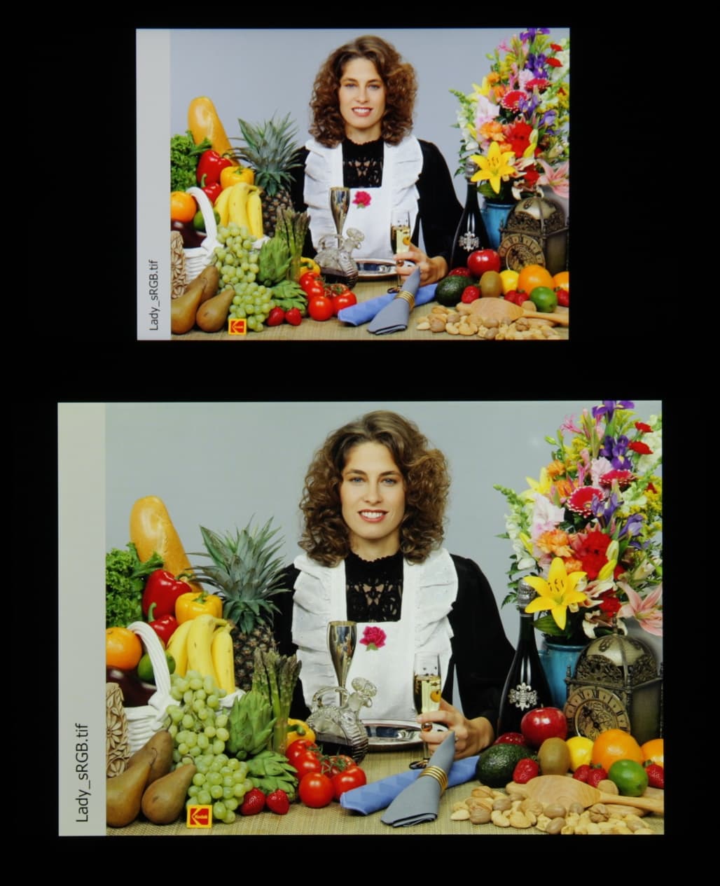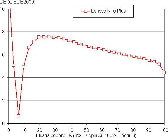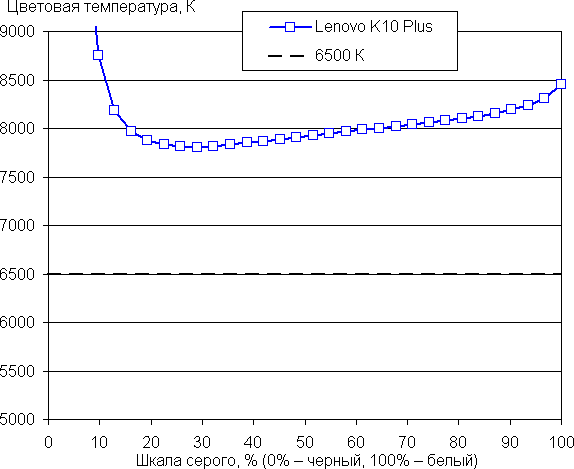 Баланс оттенков на шкале компромиссный, так как цветовая температура существенно выше стандартных 6500 К, но отклонение от спектра абсолютно черного тела (ΔE) ниже 10, что для потребительского устройства считается приемлемым показателем. При этом цветовая температура и ΔE мало изменяются от оттенка к оттенку — это положительно сказывается на визуальной оценке цветового баланса. (Самые темные области шкалы серого можно не учитывать, так как там баланс цветов не имеет большого значения, да и погрешность измерений цветовых характеристик на низкой яркости большая.)