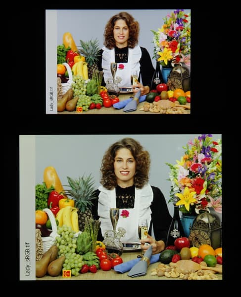 Экран имеет хорошие углы обзора без значительного сдвига цветов даже при больших отклонениях взгляда от перпендикуляра к экрану и без инвертирования оттенков. Для сравнения приведем фотографии, на которых на экраны Lenovo K10 Plus и Nexus 7 выведены одинаковые изображения, при этом яркость экранов изначально установлена примерно на 200 кд/м², а цветовой баланс на фотоаппарате принудительно переключен на 6500 К.