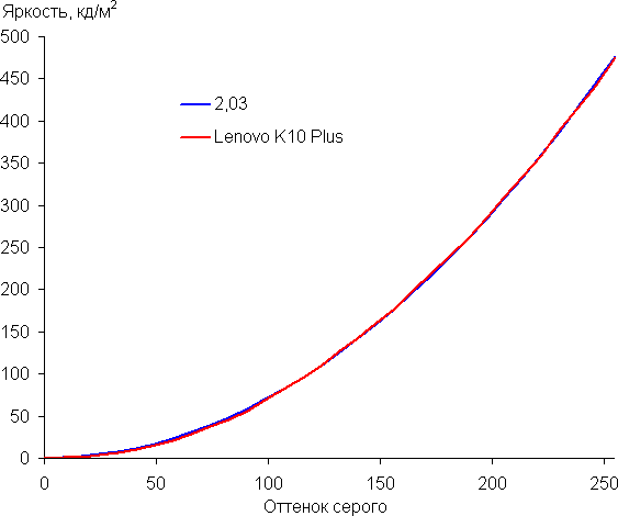Контрастность (примерно в центре экрана) высокая — порядка 1000:1. Время отклика при переходе черный-белый-черный равно 20 мс (10 мс вкл. + 10 мс выкл.). Переход между полутонами серого 25% и 75% (по численному значению цвета) и обратно в сумме занимает 34 мс. Построенная по 32 точкам с равным интервалом по численному значению оттенка серого гамма-кривая не выявила завала ни в светах, ни в тенях. Показатель аппроксимирующей степенной функции равен 2,03, что ниже стандартного значения 2,2. При этом реальная гамма-кривая мало отклоняется от степенной зависимости: