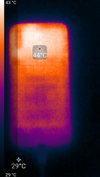 Нагрев больше вверху, что, видимо, соответствует расположению микросхемы SoC. По данным теплокамеры, максимальный нагрев составил 44 градуса (при температуре окружающего воздуха в 24 градуса), это выше среднего значения для данного теста среди современных смартфонов.