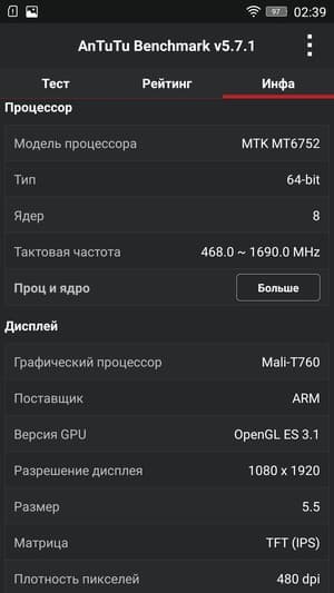 - SoC MediaTek MT6752, 1,7 ГГц, 8 ядер, ARM Cortex-A53