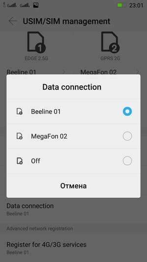 Смартфон поддерживает работу с двумя SIM-картами, организация работы с ними удобна, все настройки собраны на одной странице, разобраться несложно даже при условии отсутствия перевода части меню на русский язык. Любую из SIM-карт можно назначить основной для осуществления голосовых звонков, передачи данных или отправки SMS-сообщений. Можно выбрать желаемую карту прямо в момент вызова или набора SMS. Разъемы для SIM-карт равнозначны по своим возможностям, скоростную передачу данных в сетях 3G (4G) поддерживает любой слот, переключение карт осуществляется прямо из меню без необходимости физической смены слотов.