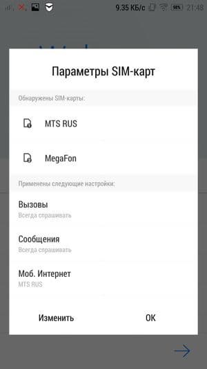 Смартфон поддерживает работу с двумя SIM-картами, и в целом работа с ними в меню организована по знакомому принципу: можно любую из SIM-карт назначить основной для организации голосовых звонков, или отправки SMS-сообщений. При наборе номера также можно выбрать желаемую карту прямо в меню телефонного интерфейса. Работа с двумя SIM-картами организована по привычному стандарту Dual SIM Dual Standby, когда обе карты могут находиться в активном режиме ожидания, но одновременно работать не могут — радиомодуль здесь только один.