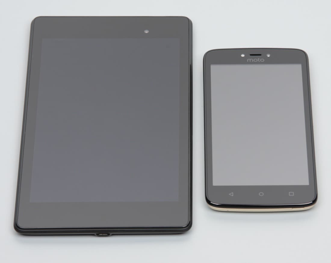 Лицевая поверхность экрана выполнена в виде стеклянной пластины с зеркально-гладкой поверхностью, устойчивой к появлению царапин. Судя по яркости отраженных объектов, антибликовые свойства экрана гораздо хуже, чем у Google Nexus 7 (2013) (далее мы сравниваем именно с ним). Для наглядности приведем фотографию, на которой в выключенных экранах обоих устройств отражается белая поверхность (Moto C легко отличить, так как он меньше):
