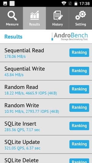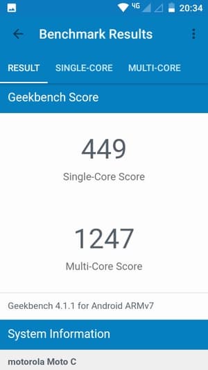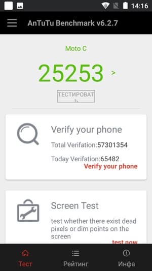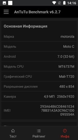 MediaTek MT6737 — одна из самых скромных по возможностям современных платформ для мобильных устройств начального уровня. Она и так-то совсем слабенькая, ориентирована на ультрабюджетный класс устройств, так к тому же здесь применяется ее ослабленная версия MT6737m с частотой ядер до 1,1 ГГц, а не 1,25 ГГц. Ждать от такой платформы достойных показателей производительности бессмысленно, герой обзора демонстрирует всего около 25 очков в AnTuTu, это совсем мало. Аппаратные возможности Moto C минимальны, смартфон во всех тестах показывает низкий уровень. Требовательные игры и графические тесты вызывают проблемы: например, Mortal Kombat X притормаживает, а старшие тесты 3DMark смартфон не проходит вовсе. Запаса мощи на будущее у такого аппарата точно нет.